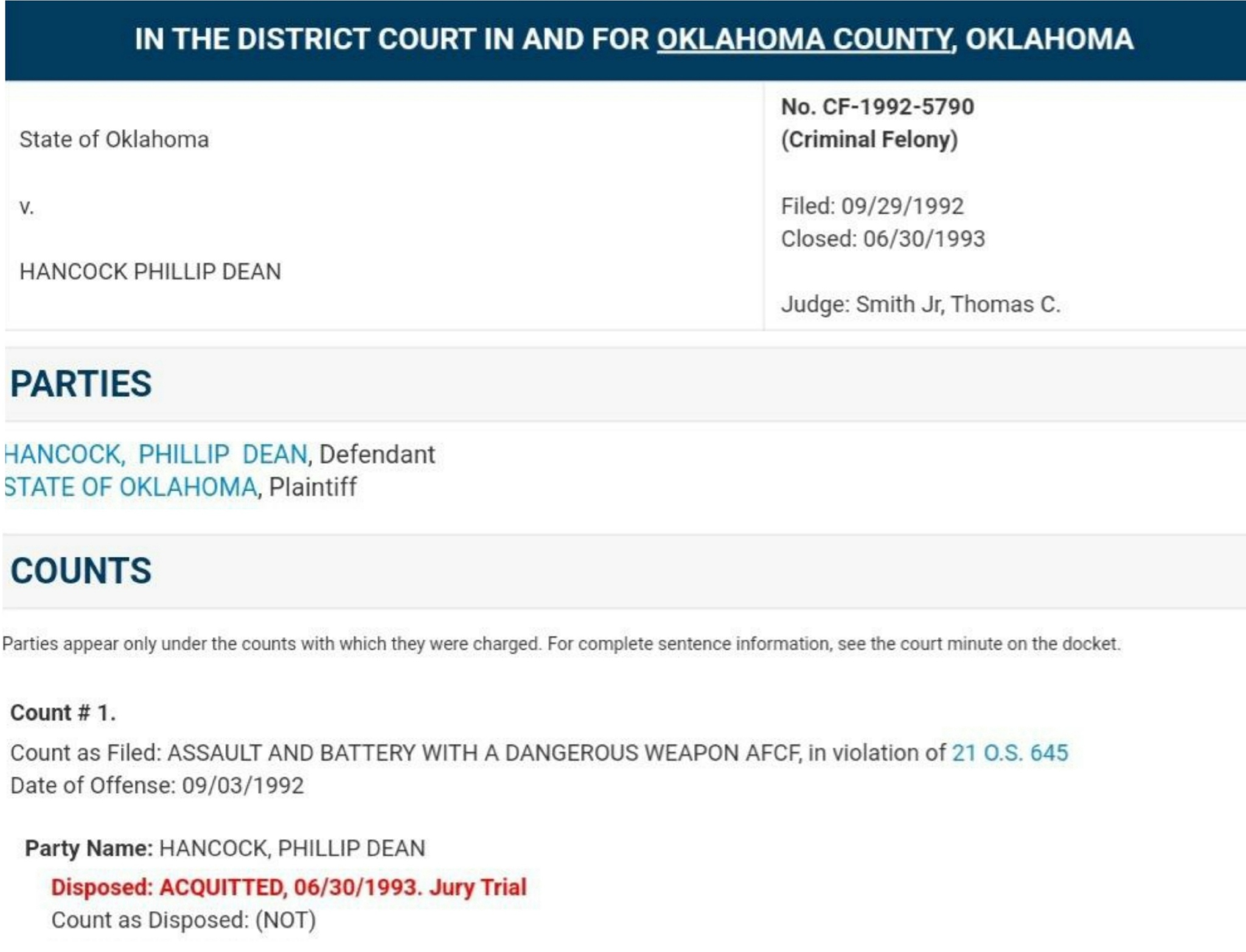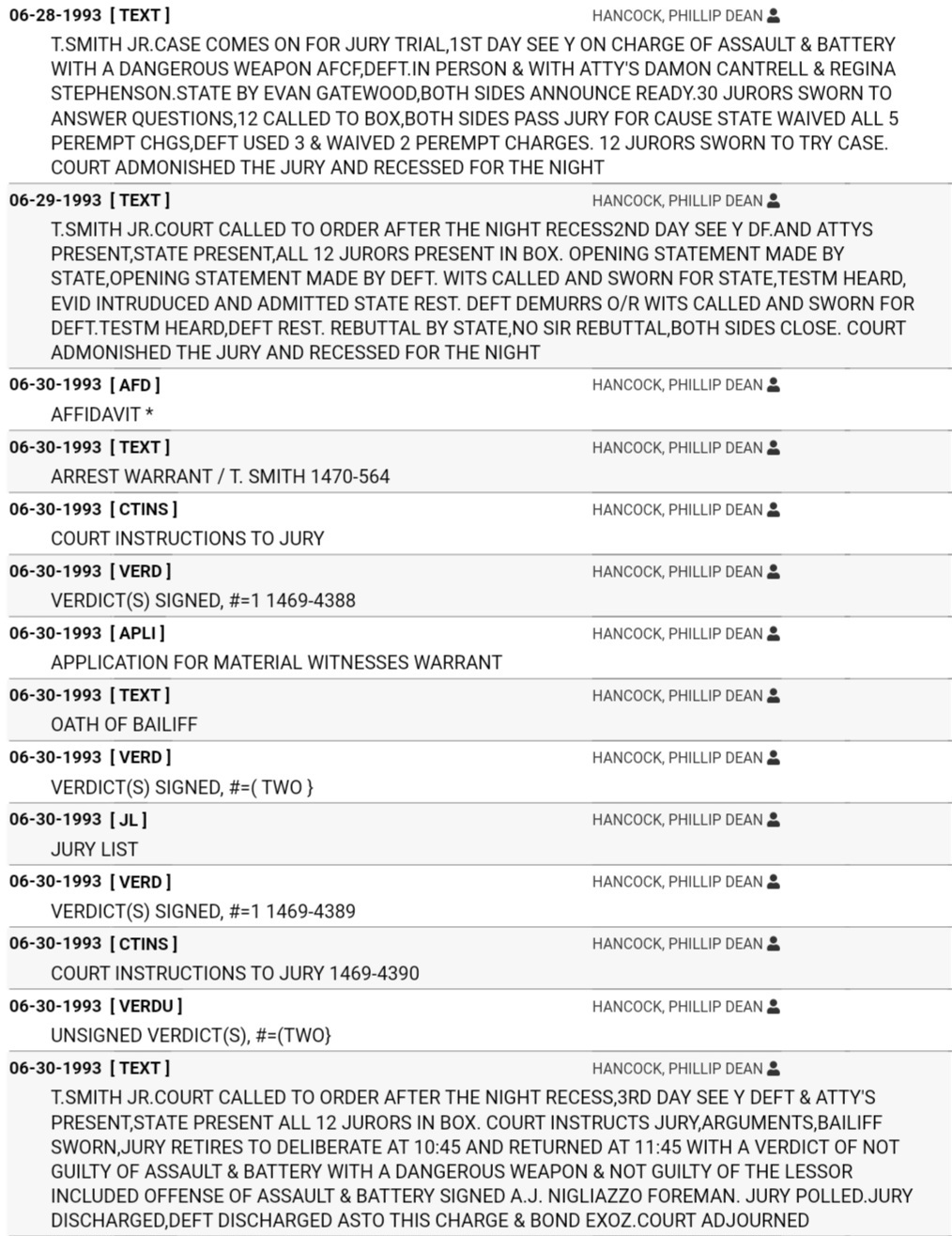 Первый суд над Хэнкоком был в июне 1993 года за избиение знакомого, на котором присяжные полностью его оправдали, несмотря на показания жертвы, признав невиновным за это преступление: