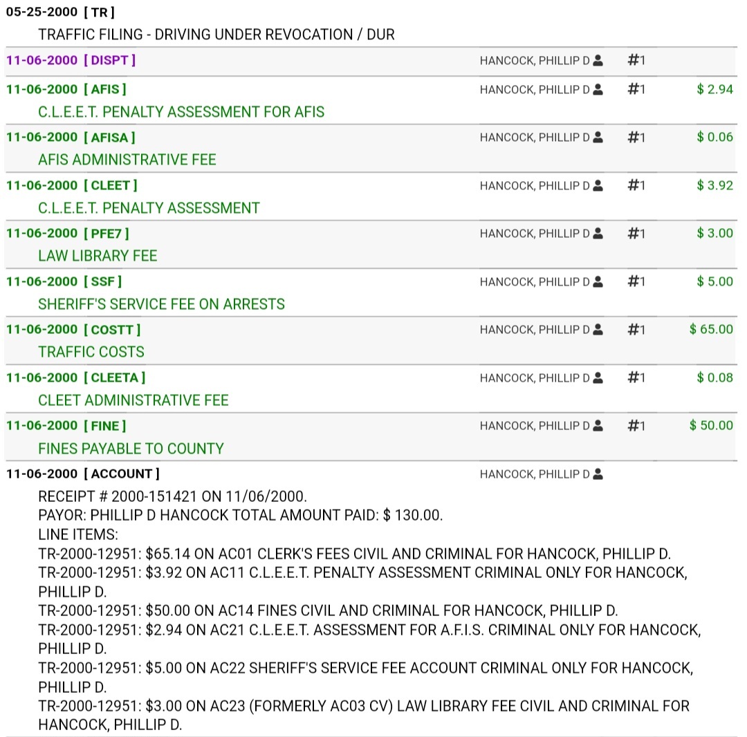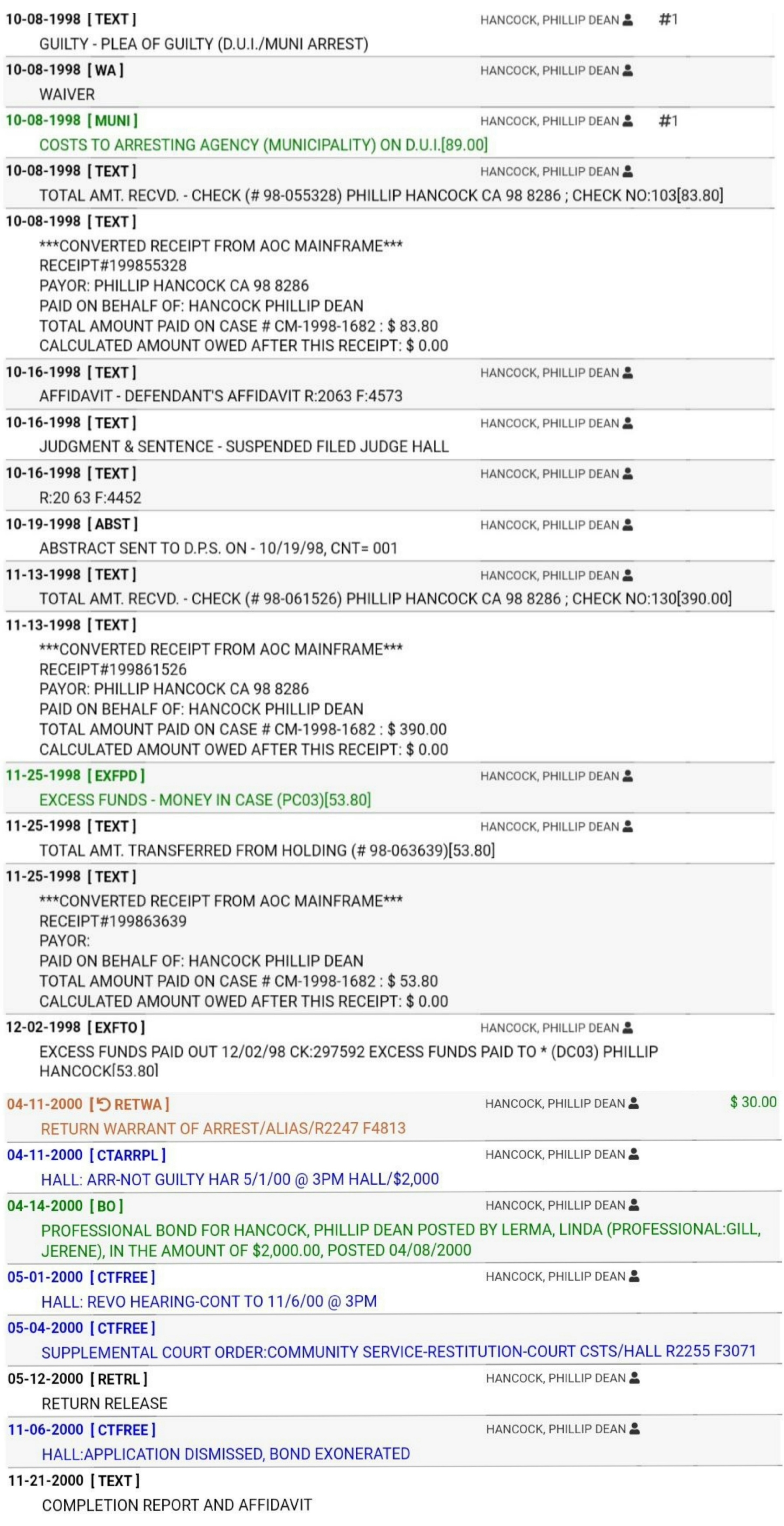 Хэнкок после осуждений 1993 года вплоть до 1998 снова не имел проблем с законом и легально работал, всё также продолжая употреблять алкоголь и марихуану, но 13 июня того года он был арестован полицией за пьяное вождение, что повлекло за собой предъявление соответствующего обвинения. По нему он в октябре заключил сделку с прокуратурой, сразу признав себя виновным без суда присяжных и получив в обмен неназванное количество часов общественных работ, а также отзыв водительских прав и штраф в 527 долларов для покрытия судебных расходов. Однако, 8 апреля 2000 года, Хэнкока арестовала полиция за вождение без прав, что повлекло предъявление соответствующего обвинения и приказ о увеличении часов общественных работ, на которые его отпускали вплоть до ноября. Тогда же, в ноябре, Хэнкок снова признал себя виновным без суда присяжных и был приговорён к штрафу в 130 долларов для покрытия судебных расходов: