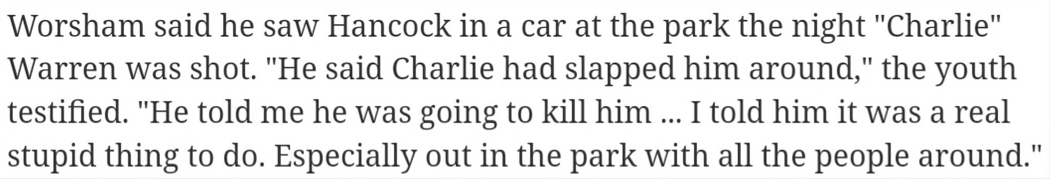 Вечером 26 мая, Хэнкок попросил своего друга Кеннета Рэя Халси, 16 лет, подвезти его на своей машине до того парка и взять с собой пистолет калибра .22 дюйма (5,6 миллиметров), на что тот согласился. По приезду на многолюдную парковку парка, Хэнкок, сидевший на пассажирском сиденье машины, увидел другого наркомана - Брэда Уоршема, 16 лет - и позвал его к себе. Когда тот подошёл, Хэнкок рассказал ему как он хочет убить Уоррена в этом парке из-за того избиения при помощи Халси, что сидел на водительском сиденье, а Уоршем в ответ попытался отговорить Хэнкока от задуманного, указывая на большое количество свидетелей, но Хэнкок отказался его слушать: