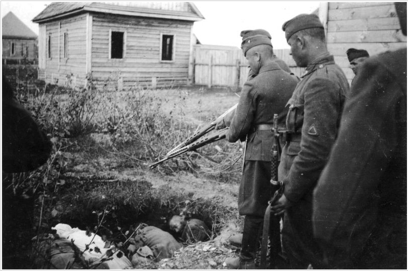 Венгерские солдаты с трофейными советскими винтовками СВТ-40 у ямы, в которую согнали советских мирных жителей. Подростки, женщины с детьми и старики еще живы на этом фото, но через минуту начнется расстрел. Их убьют за то, что они русские...