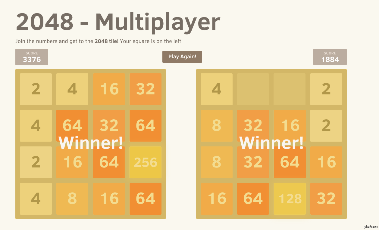 2 Humz Ничья. 11 лет назад Мультиплеер http://emils.github.io/2048-multiplayer/ [моё] 2048 Мультиплеер