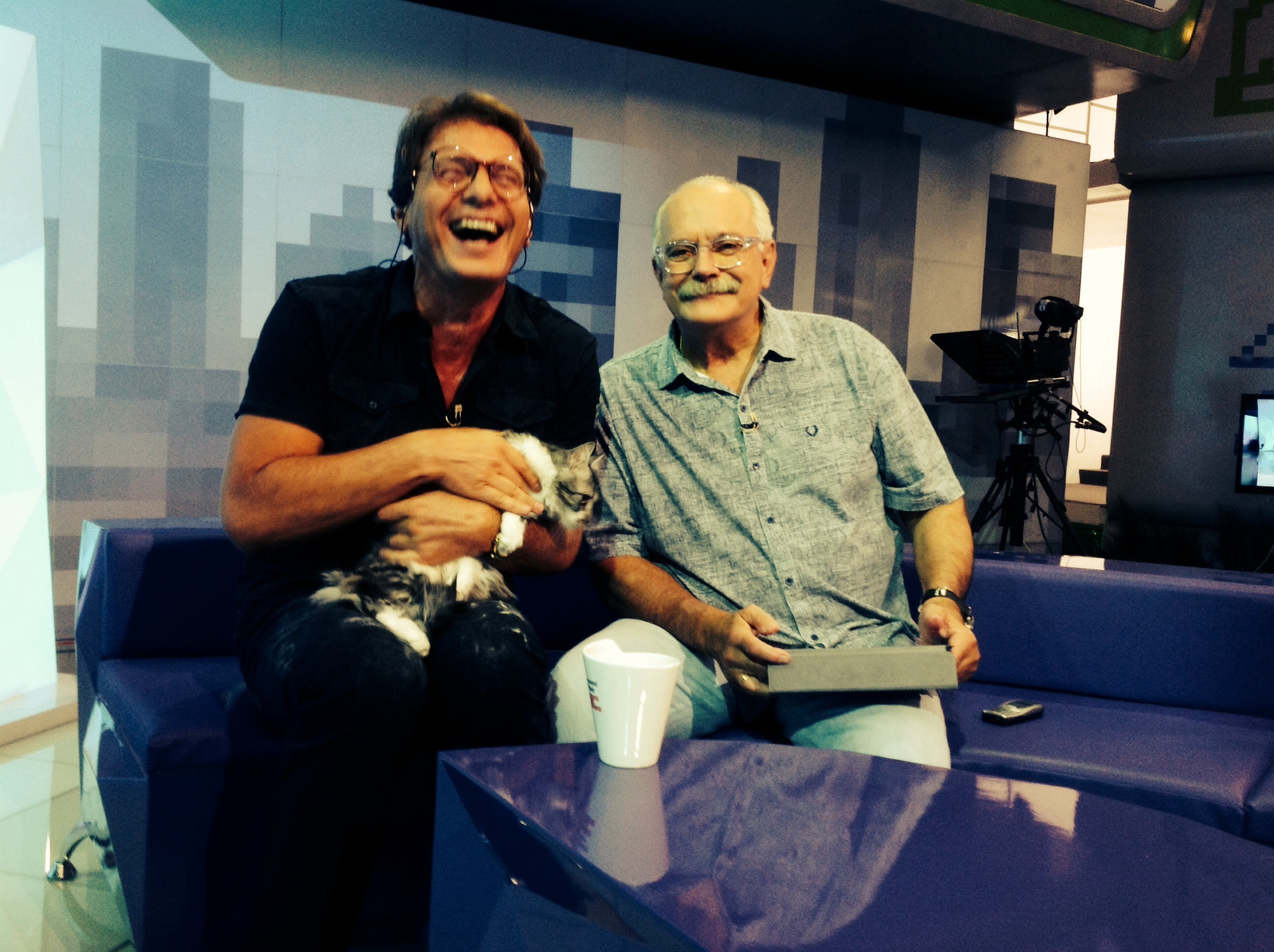 Во время одной из наших бесед случилась накладка, назову это так. Дело было лет десять назад. По формату телепрограммы это были интервью в прямом эфире. Со мной — на диванчике ведущего — тусила кошка из приюта; с гостем, как правило, я по ходу беседы поднимал тему домашних питомцев, а после окончания эфира наш фотограф делал снимок для приюта — гость программы, ведущий и животное. Как правило, среди зрителей находились желающие взять очередную бесхозную хвостатую «звезду экрана».