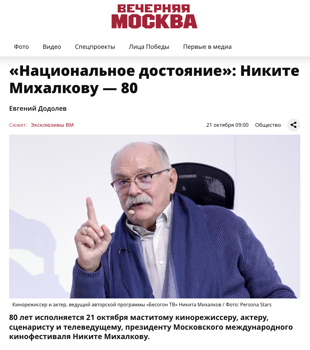 80 лет исполнилось 21 октября маститому кинорежиссеру, актеру, сценаристу и телеведущему, президенту Московского международного кинофестиваля Никите Михалкову.