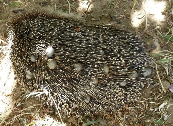 Шарики на иголках - это раздувшиеся и наевшиеся клещи. На диких животных их может быть очень много.