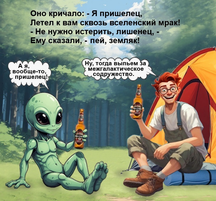 2 VeStr28 Юмор Никогда не знаешь, с кем выпиваешь Серия Озорные Рассмешизмы 4 часа назад [моё] Контент нейросетей Юмор Ирония Пришельцы Пиво Дружба Арты нейросетей 2 1 Ещё 0