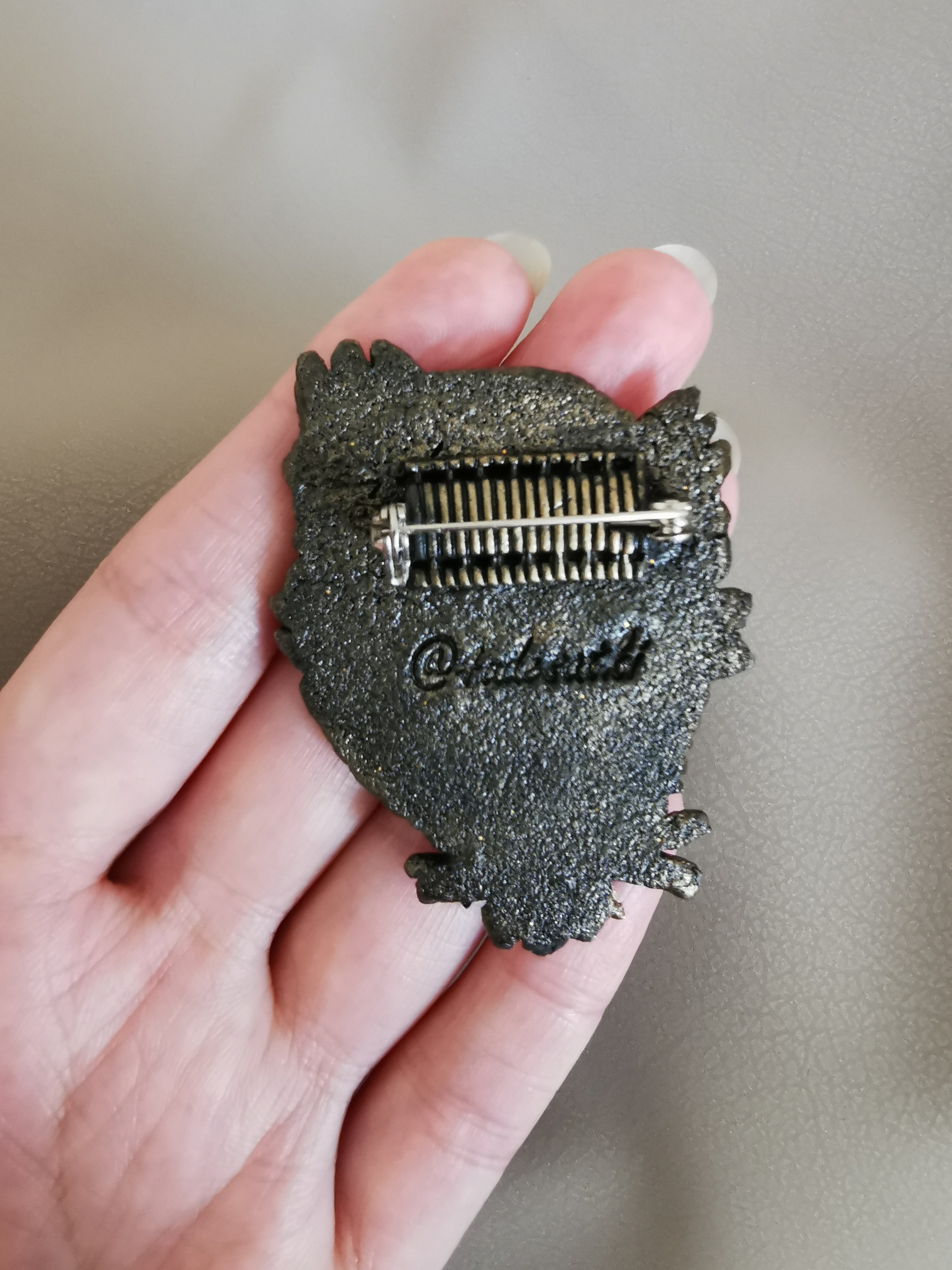 Материалы: полимерная глина, кабошоны, пигменты, булавка с противоугонным замком, краски для глаз, лак.