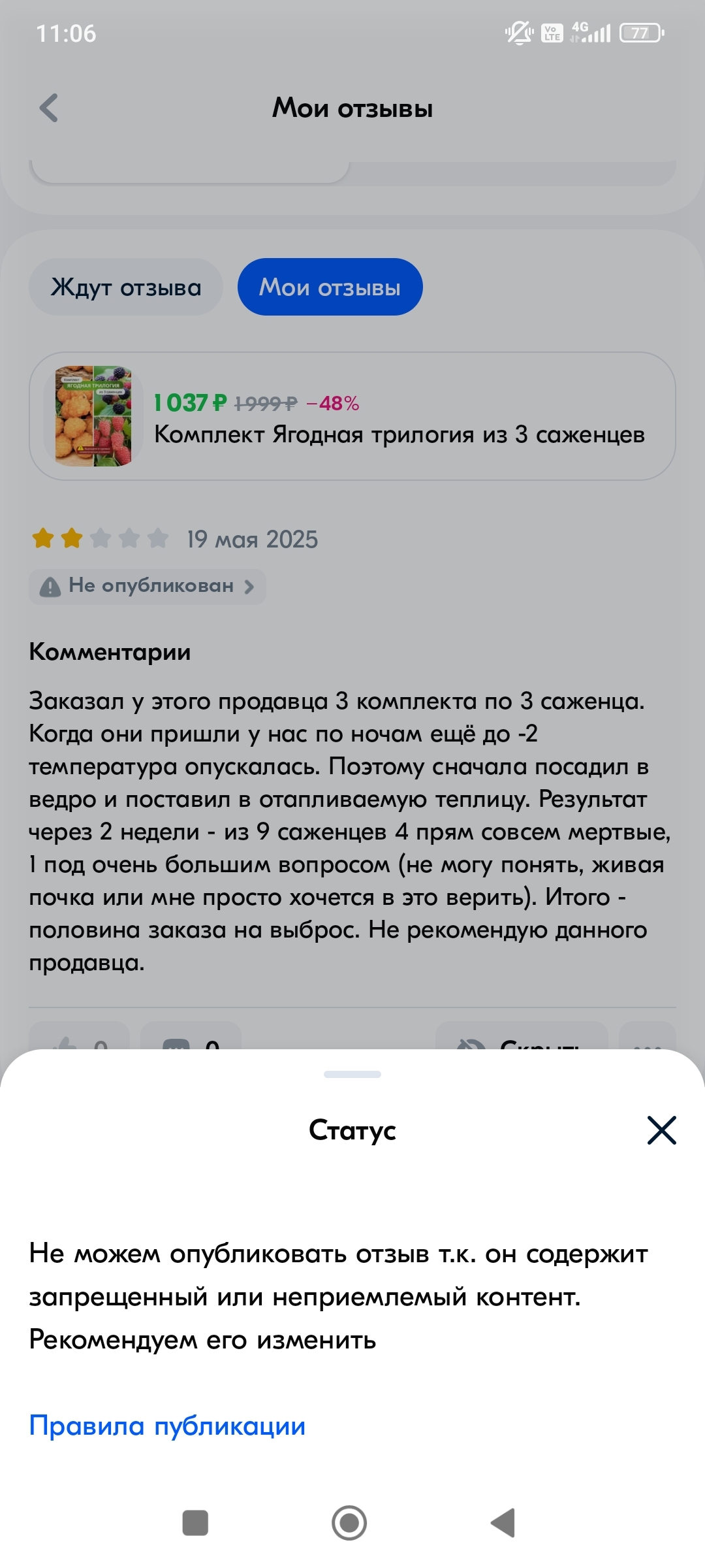 Оставил негативный отзыв на Озоне. Никакого экстремизма, оскорблений и другого запрещённого не писал - чисто по делу, обычный отзыв о некачественном товаре. Озон его отклонил как нарушающий их требования. Через поддержку не удалось получить ответ, что же я нарушил. Поэтому пробую тут. @Ozon, поясните, пожалуйста, какие пункты правил нарушил мой отзыв, чтобы я мог его исправить.