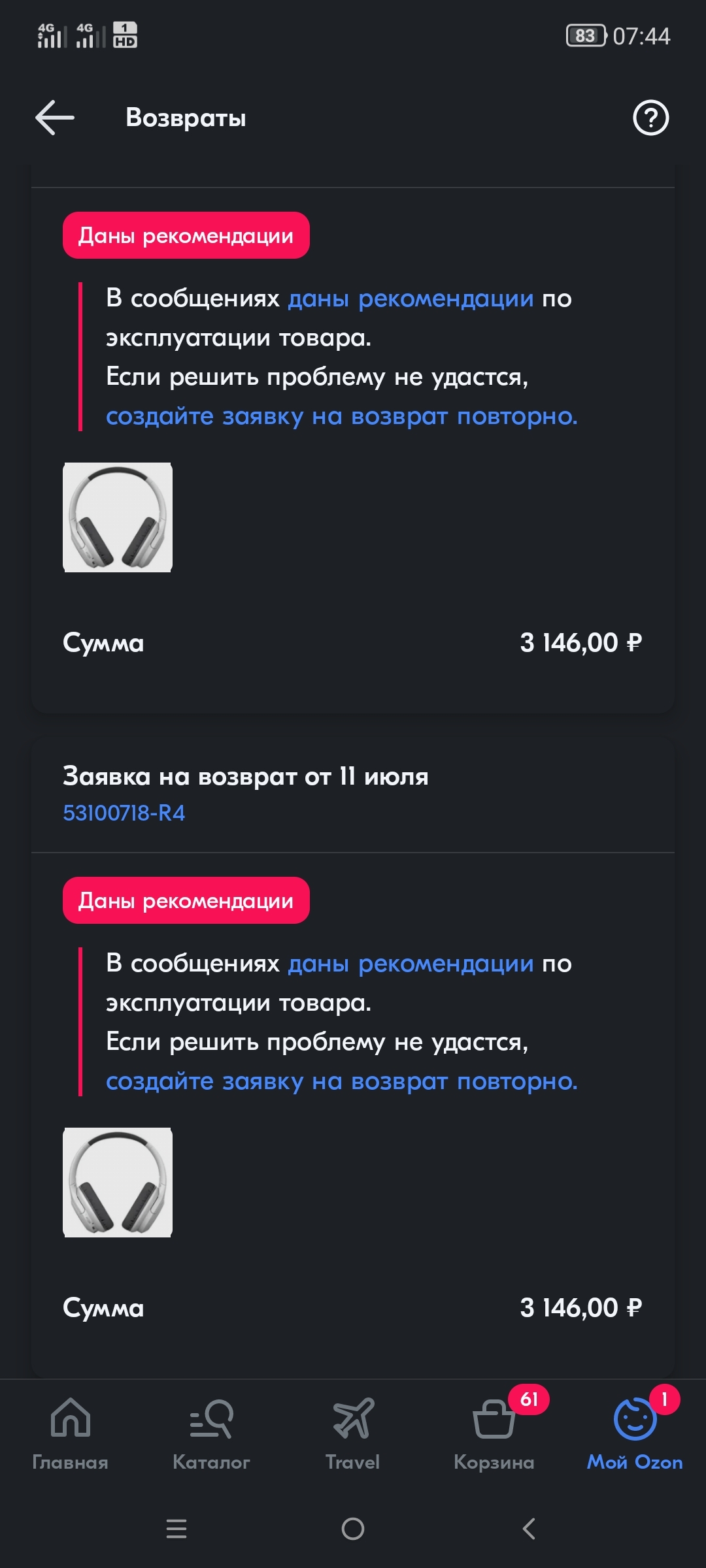 На всю проверку ушло примерно пол часа +-. Мне такой расклад совершенно не понравился, поэтому сразу же оформил заявку на возврат, указав, что товар мне не подходит и описав нюанс с микрофоном. И тут началось. Тянули с решением практически до последнего, я и до этого заявки делал на возврат и в ближайшие пол часа, максимум час одобряли, а тут прошло 2 дня и максимум, что сделала поддержка - отменила заявку и дала рекомендацию снова оформить, однако причину указать "товар не работает, плохо работает". По моему мнение - рекомендация странная, т.к. дело не в том, что наушники плохо работают, это такая специфика работы у них.