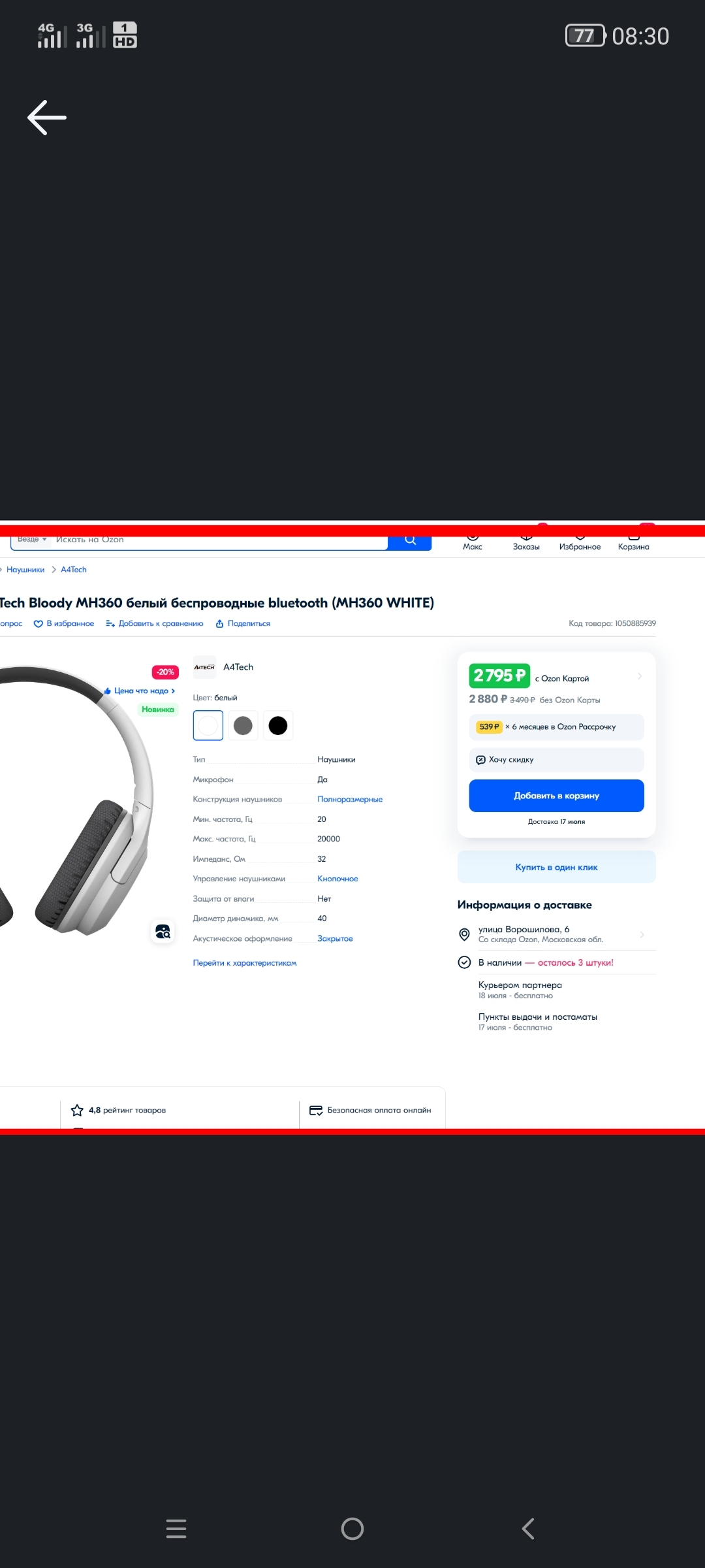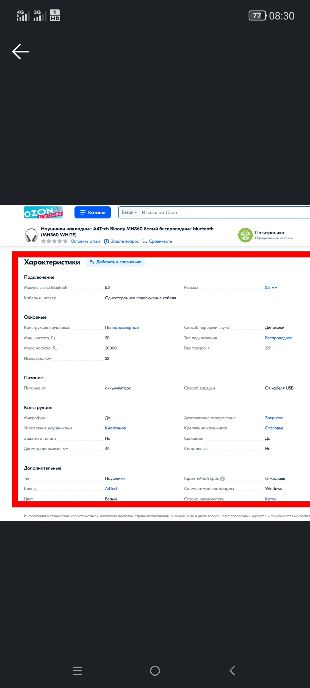 07.07.23 решился заказать наушники на данной площадке. Казалось бы, что может пойти не так? Недавно у фирмы Bloody вышла новая модель, MH360, которая имеет как и проводное подключение через jack 3.5, так и беспроводное bluetooth 5.3. Таких нигде нет, кроме озона, да и там вроде только от одного магазина - Позитроника называется. Т.к. вышли они буквально за полторы недели до заказа - отсутствие на других площадках и отзывов на них не смутило.