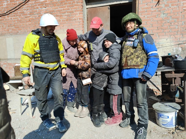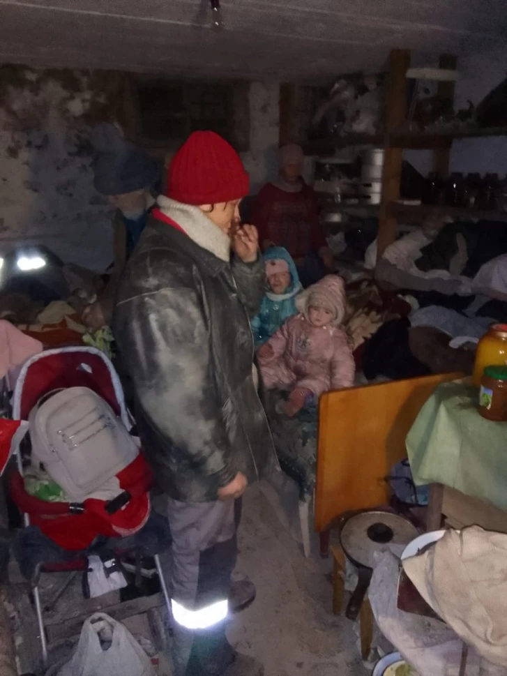 Я не знаю, как зовут людей на этой фотографии, я принес им продукты. Это семья: бабушка, дедушка, мама и двое детей. Они живут в подвале уже больше двадцати дней. Им повезло. Сейчас объясню, почему. Больше половины горожан застали военные действия не дома. Кто-то был в гостях, кто-то на работе. Вот представьте: мы сейчас сидим с вами в нашем офисе на улице Крауля в Екатеринбурге (мы встречались с Евгением на его рабочем месте. — Прим. ред.), и вдруг... боевые действия, обстрелы. И всё! Мы на двадцать дней остались здесь в подвале, не зная, что там с родными, где они, живы ли. Мобильной связи в городе нет, работают только рации. Их у мирных жителей, конечно, нет. Никто не был готов к такому. Поэтому именно этой семье повезло: когда всё началось, они были дома, и сейчас вместе.