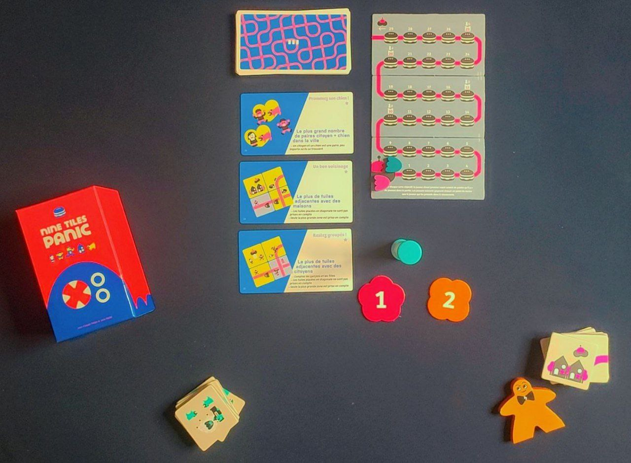 Nine tiles panic - довольно простая игра в реальном времени. Игрокам предстоит максимально эффективно составить собственный город из 9-ти доступных ему плиток сеткой 3х3, ориентируясь на условия карт Миссий. В каждом раунде игроки будут стараться выполнять открытые цели, чтобы заработать как можно больше победных очков. Игрок, чей город лучше всего соответствует заданным на картах условиям, получает наибольшее количество очков. По истечении нескольких раундов побеждает тот игрок, кто лучше всего организовал свой город и набрал большее количество победных очков на шкале Подсчёта!