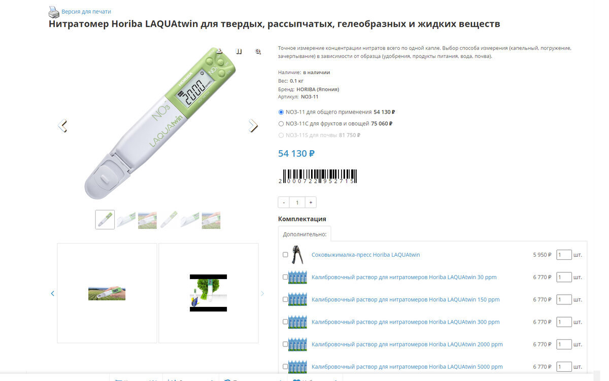 В продаже мы нашли нитратомер, который работает по методу ISE, при этом измеряя нитраты без приготовления растворов (но все же с некоторыми заморочками, кому интересно, можете посмотреть здесь) - это японский нитратомер Horiba LAQUAtwin. Стоит он 75000 рублей. В инструкции к прибору указана погрешность 10%. Насколько точно работает этот нитратомер, к сожалению, мы сказать не можем.
