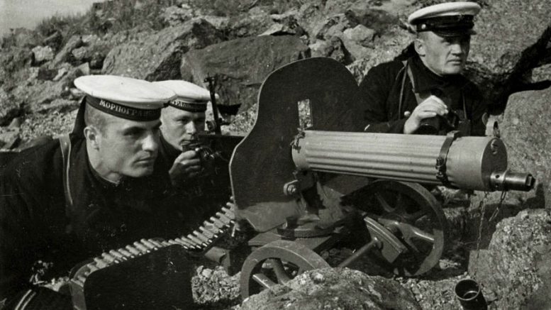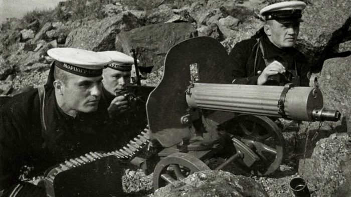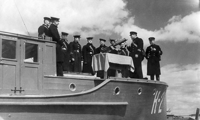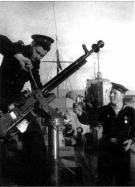 Май 1942 года, Дальний Восток, экипаж пограничного катера «К-2» изучает материальную часть станкового пулемёта «максим» как табельного средства вооружения своего построенного из дерева боевого плавсредства.