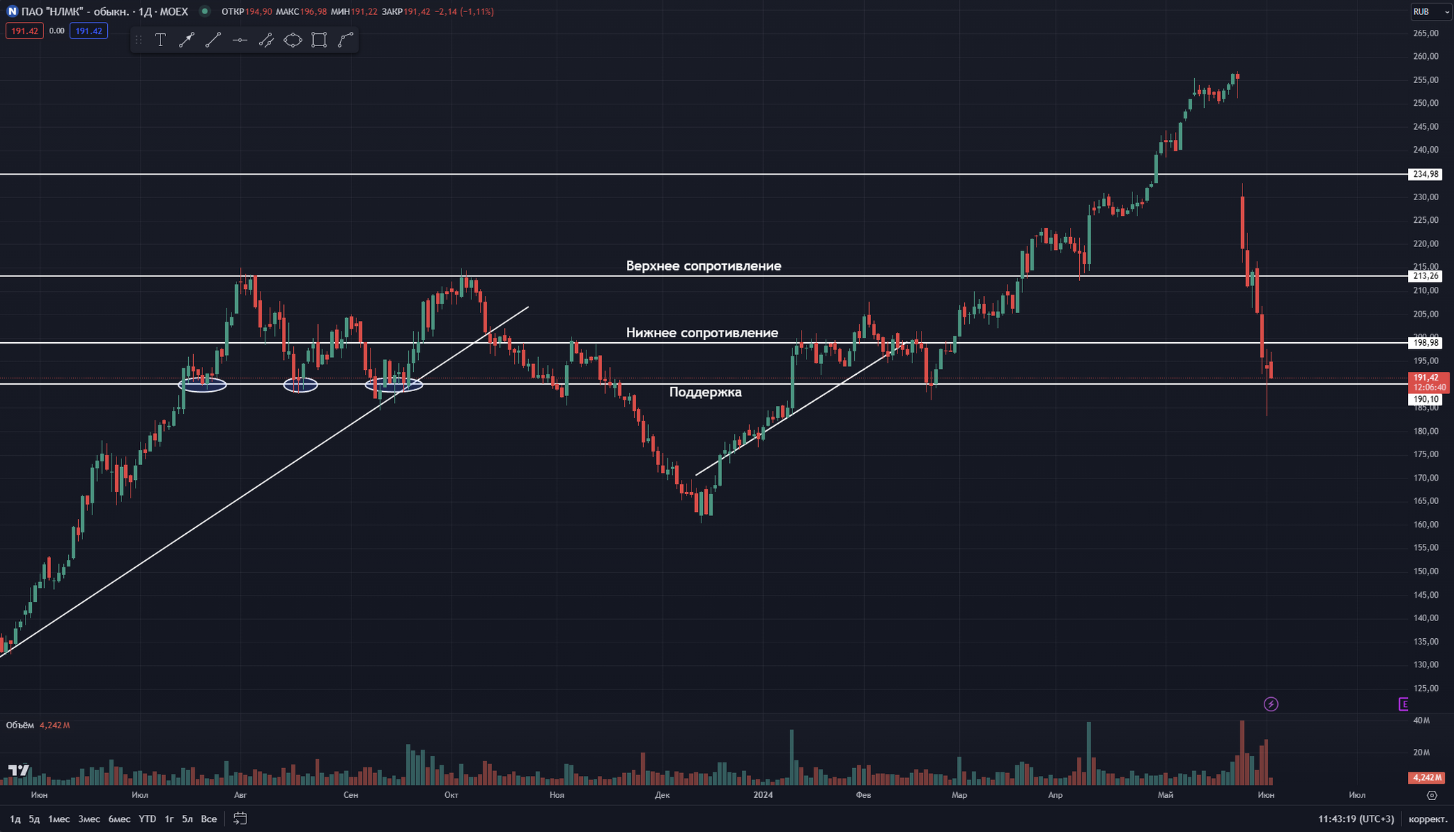 Акции НЛМК не повезло с дивидендным гэпом, попал в период коррекции широкого рынка. Бумага скорректировалась к сильному уровню поддержки в районе 190,10 рублей.