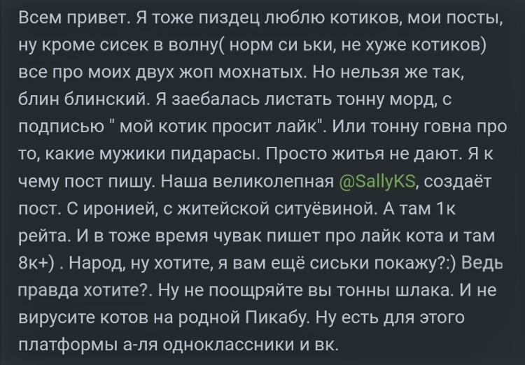 Всем привет. Я тоже пиздец люблю котиков, мои посты, ну кроме сисек в волну( норм си ьки, не хуже котиков) все про моих двух жоп мохнатых. Но нельзя же так, блин блинский. Я заебалась листать тонну морд, с подписью " мой котик просит лайк". Или тонну говна про то, какие мужики пидарасы. Просто житья не дают. Я к чему пост пишу. Наша великолепная @SallyKS, создаёт пост. С иронией, с житейской ситуёвиной. А там 1к рейта. И в тоже время чувак пишет про лайк кота и там 8к+) . Народ, ну хотите, я вам ещё сиськи покажу?:) ( сарказм, ес чо). Ну не поощряйте вы тонны шлака. И не вирусите котов на родной Пикабу. Ну есть для этого платформы а-ля одноклассники и вк.