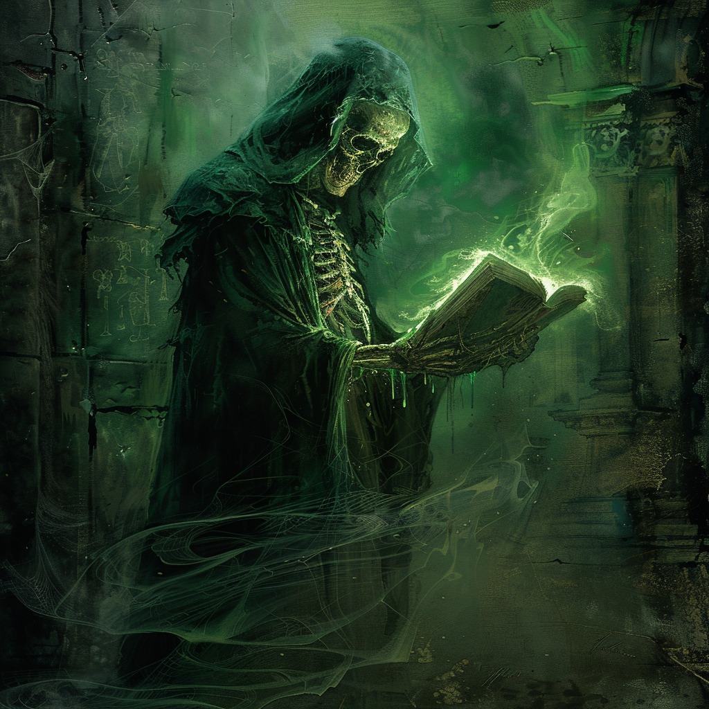В жутком зелёном свете вы готовитесь к атаке. Вы имеете возможность снизить боевые возможности костяного волшебника, для этого при нападении вам нужно немного удачи:
