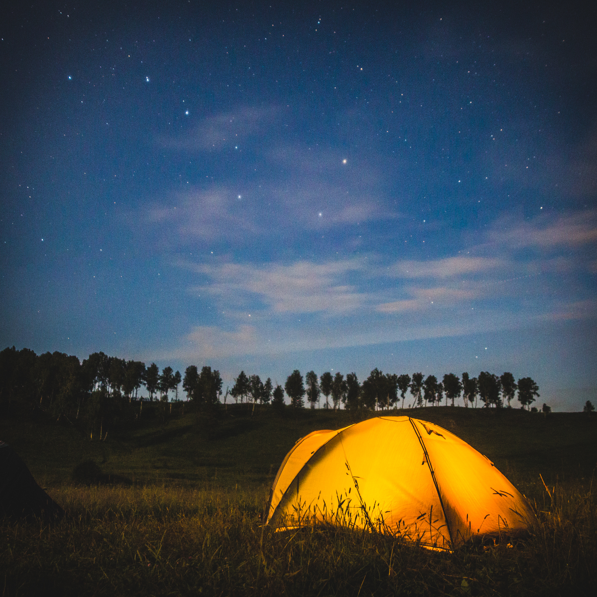 Палатка подсвечена изнутри фонарём yongnuo 360, жёлтые диоды на минимуме. Земля подсвечена луной из-за облаков.