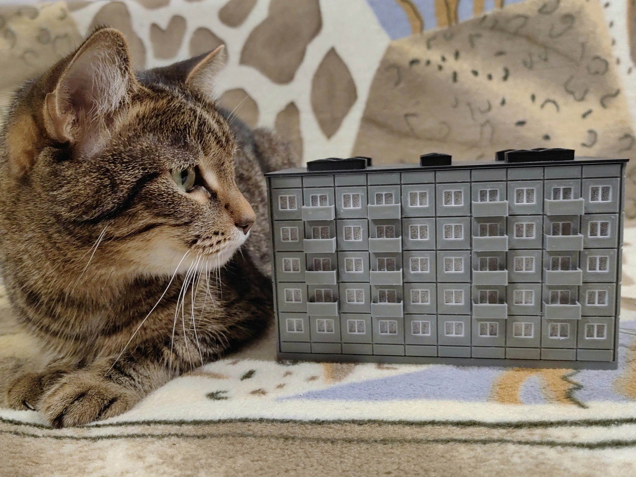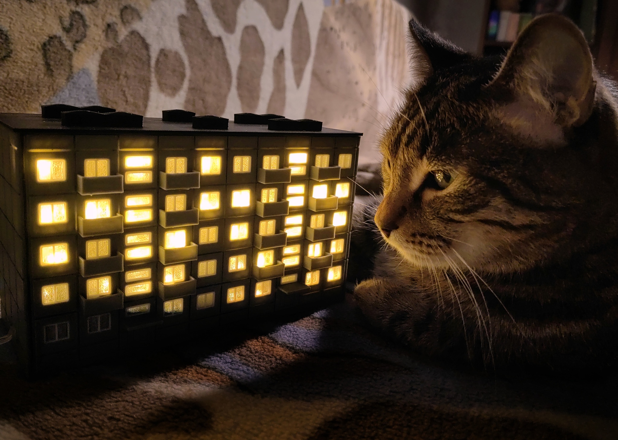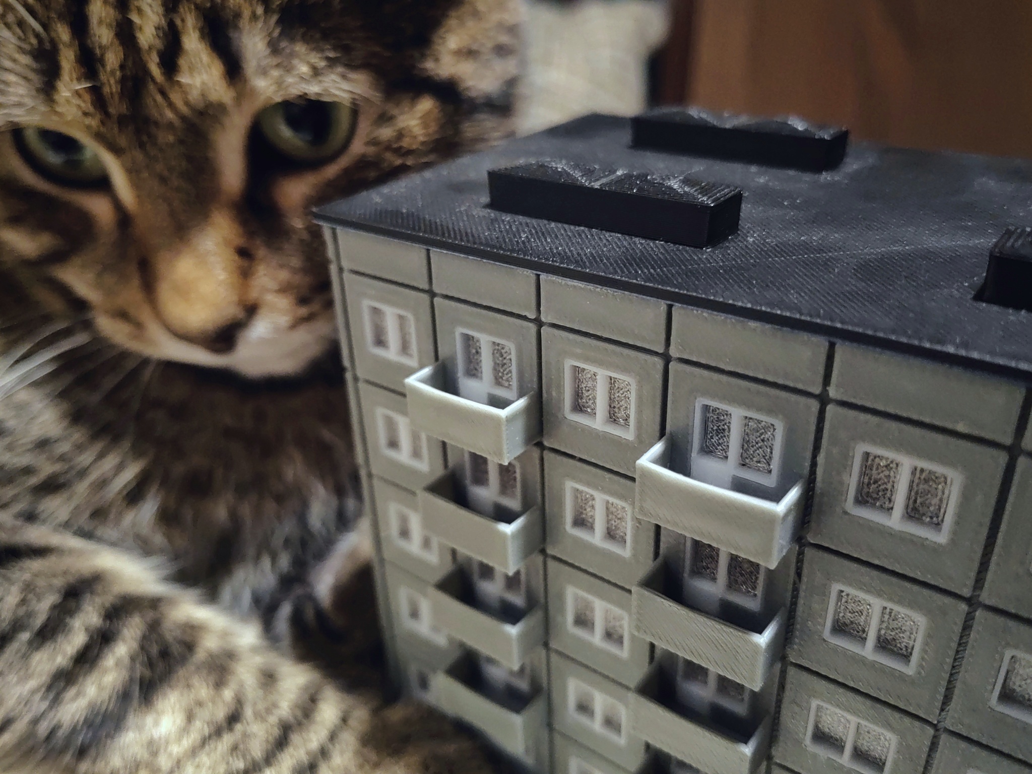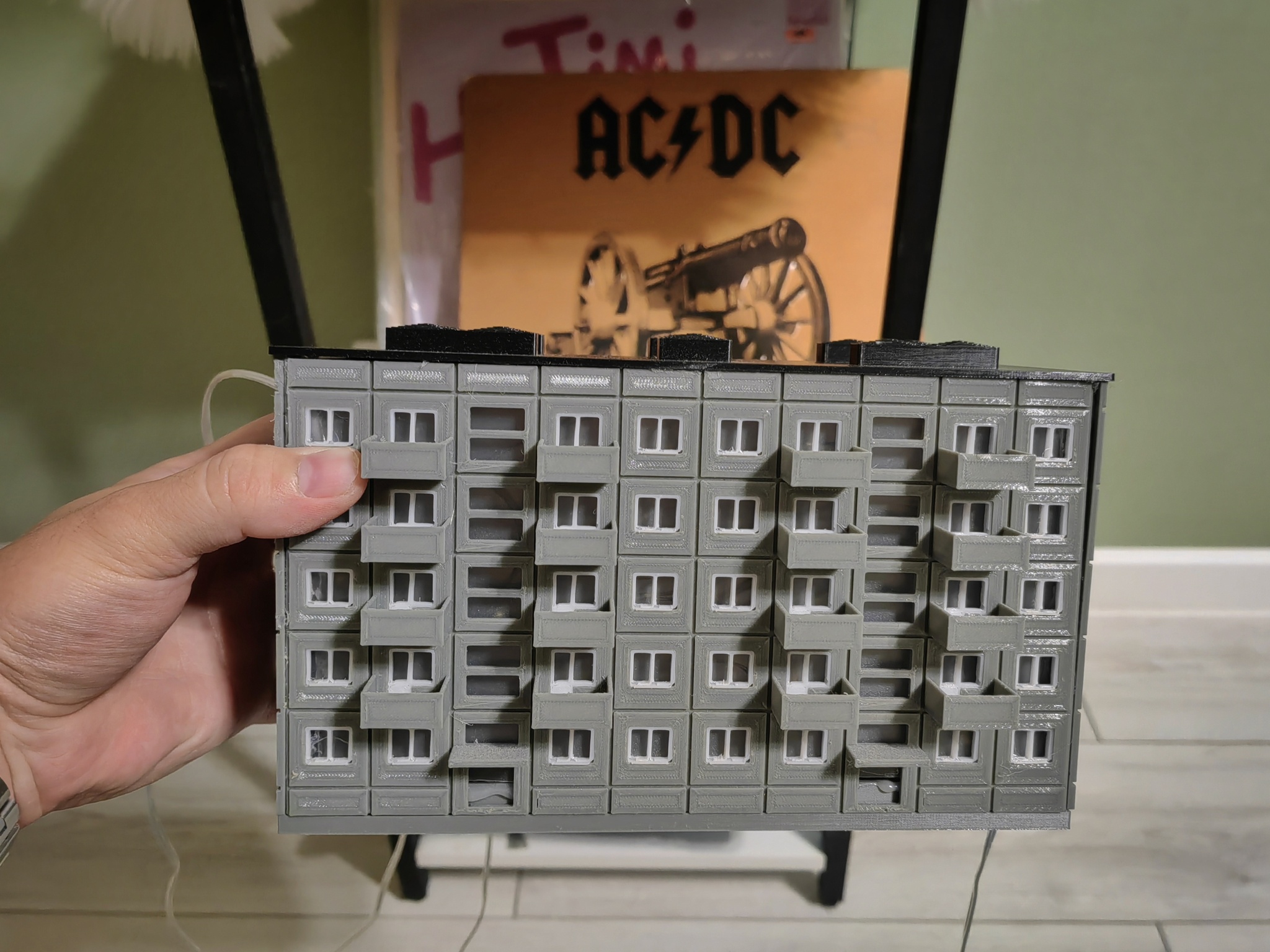 После некоторого количества доработок определился с оптимальным размером и пришёл к варианту, когда прочная несущая конструкция с креплениями для светодиодов печатается отдельно, а внешние панели на неё просто навешиваются. На этом этапе модель достигла той стадии, когда её можно просто пустить на печать и потом неспеша собрать за 10-15 минут. Есть ещё много мыслей по допиливанию, вроде адресных диодов с ардуиной для имитации освещения настоящей многоэтажки, но уже сейчас я доволен результатом.