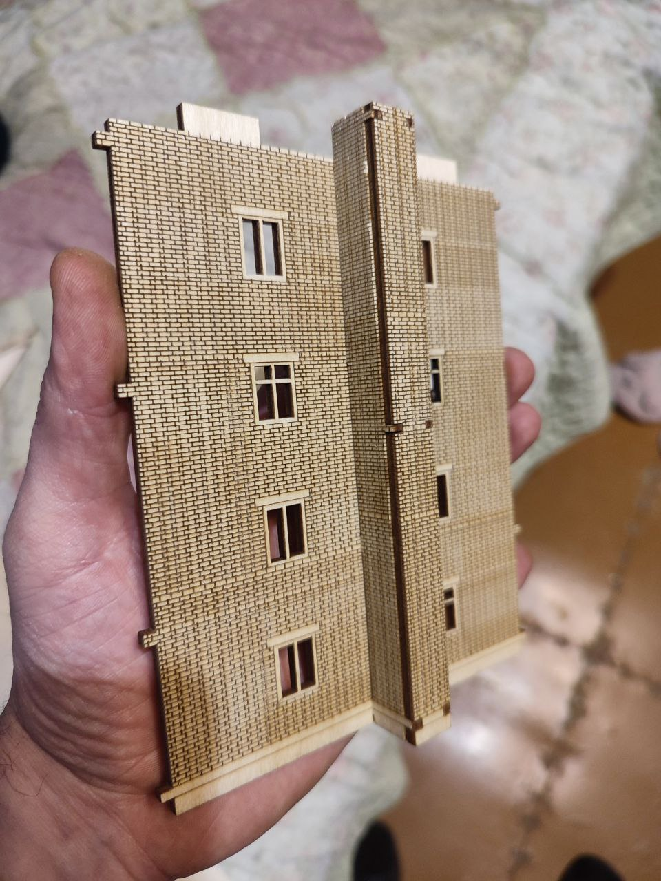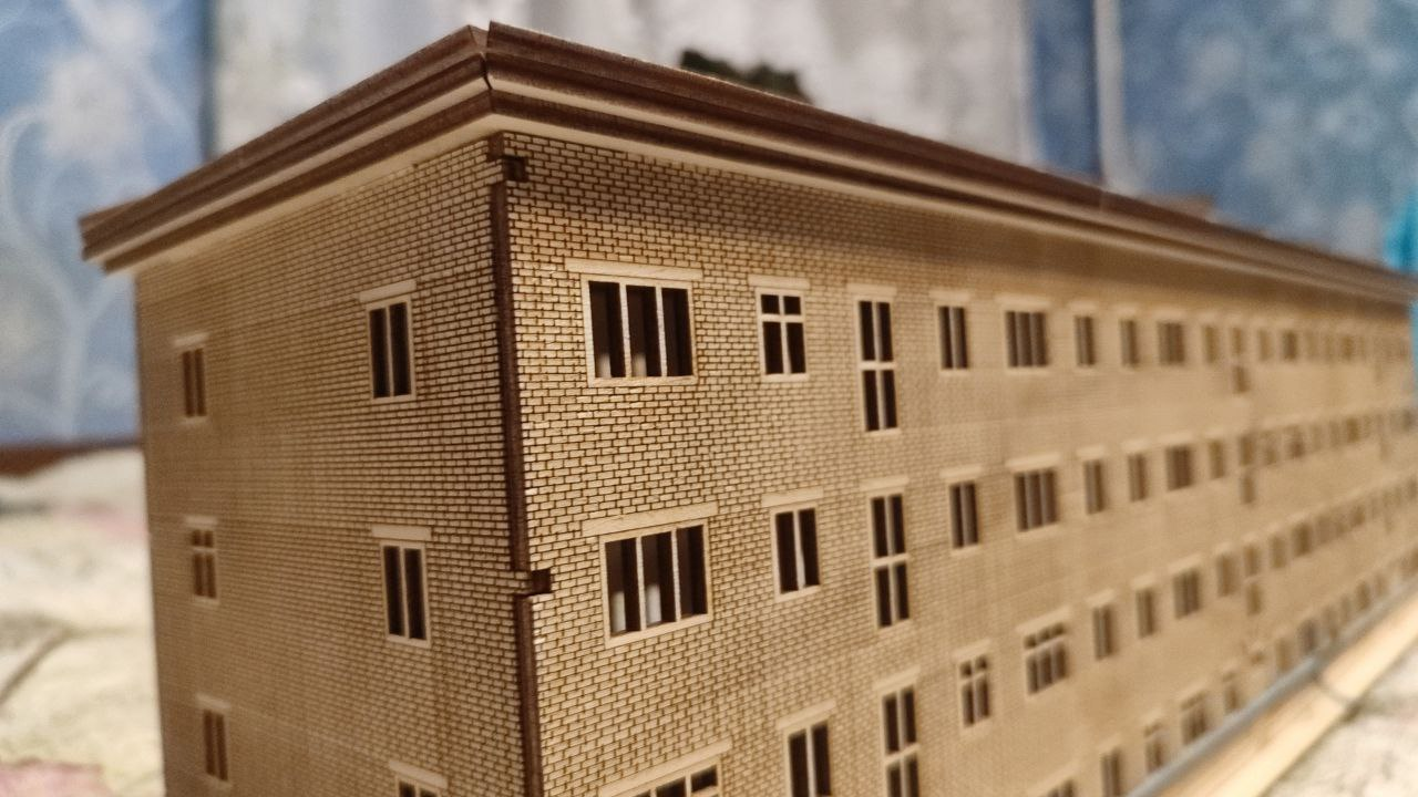 Нюанс этого домика, что он не панелька, а кирпичный. Стенки - не печать на фанере рисунка, а прорезка каждого кирпича лазером. Размер кирпичика 1х2.5мм, а их тут ох как много...