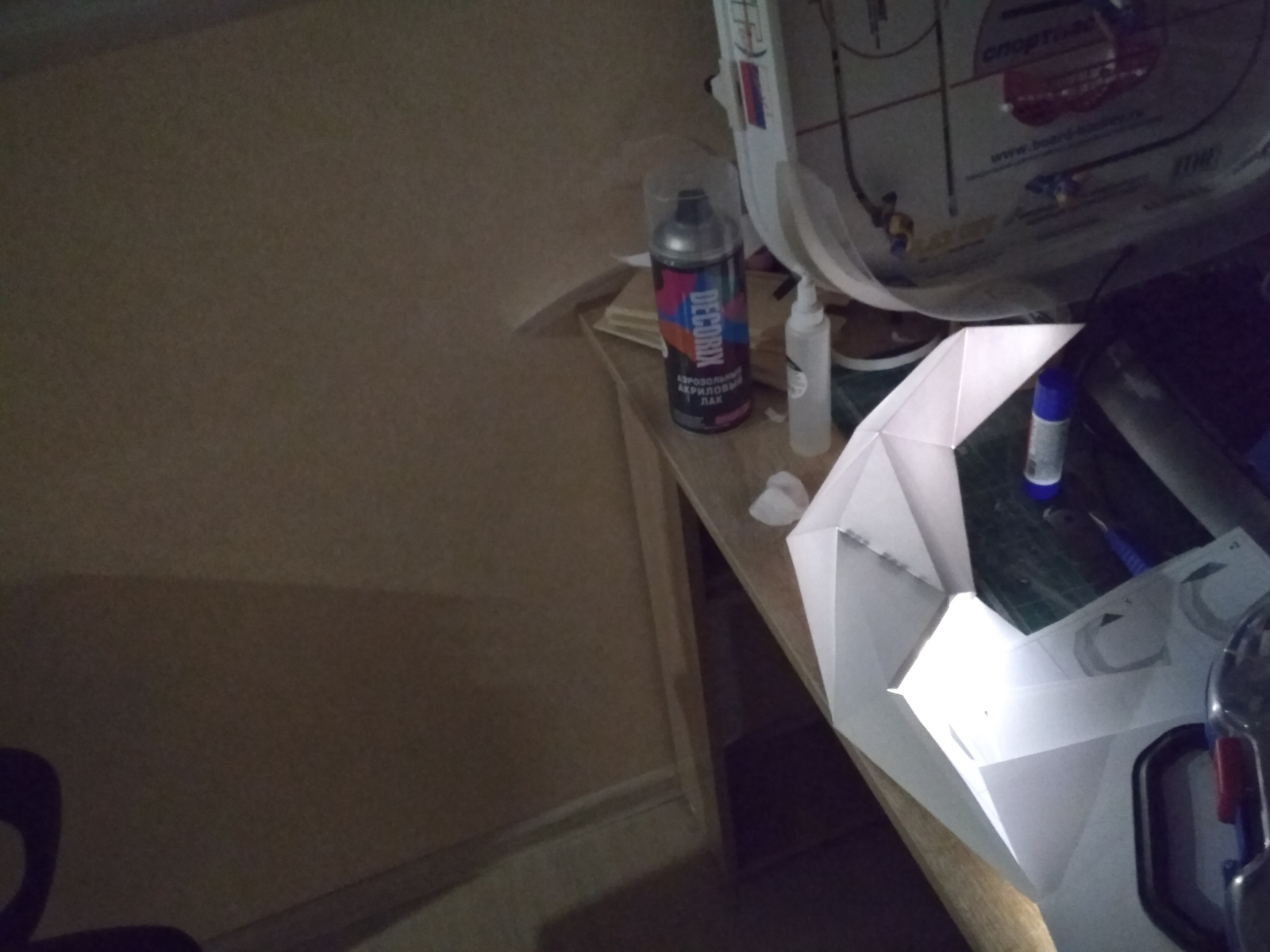 Попутно со склейкой протягивал светодиодную ленту холодного белого света. Укрепил место штекера несколькими слоями бумаги - видно темное пятно (Может кто подскажет иной способ?). Всё это дело подключено через диммер - можно регулировать яркость.