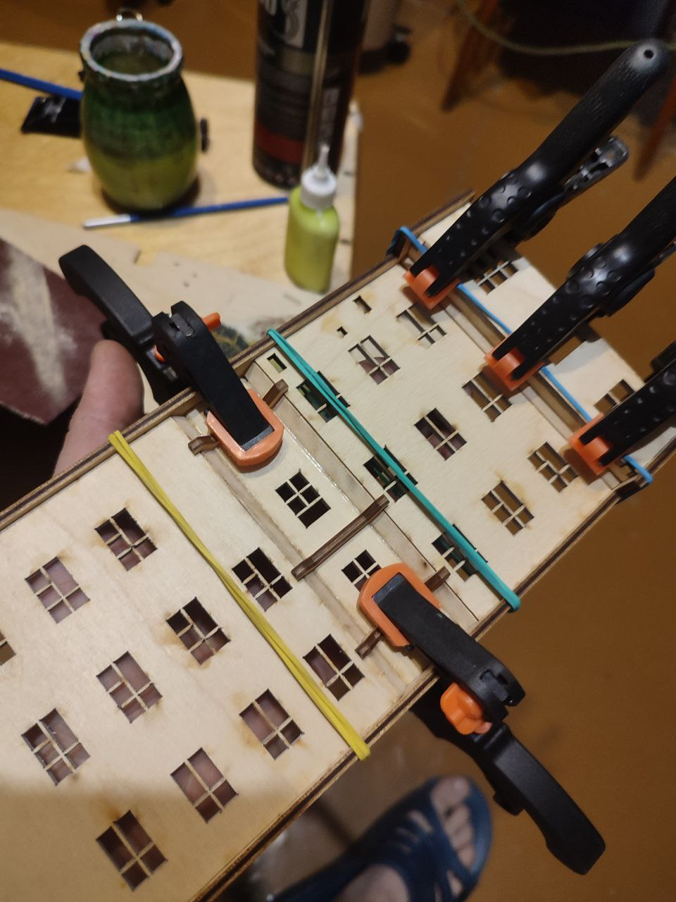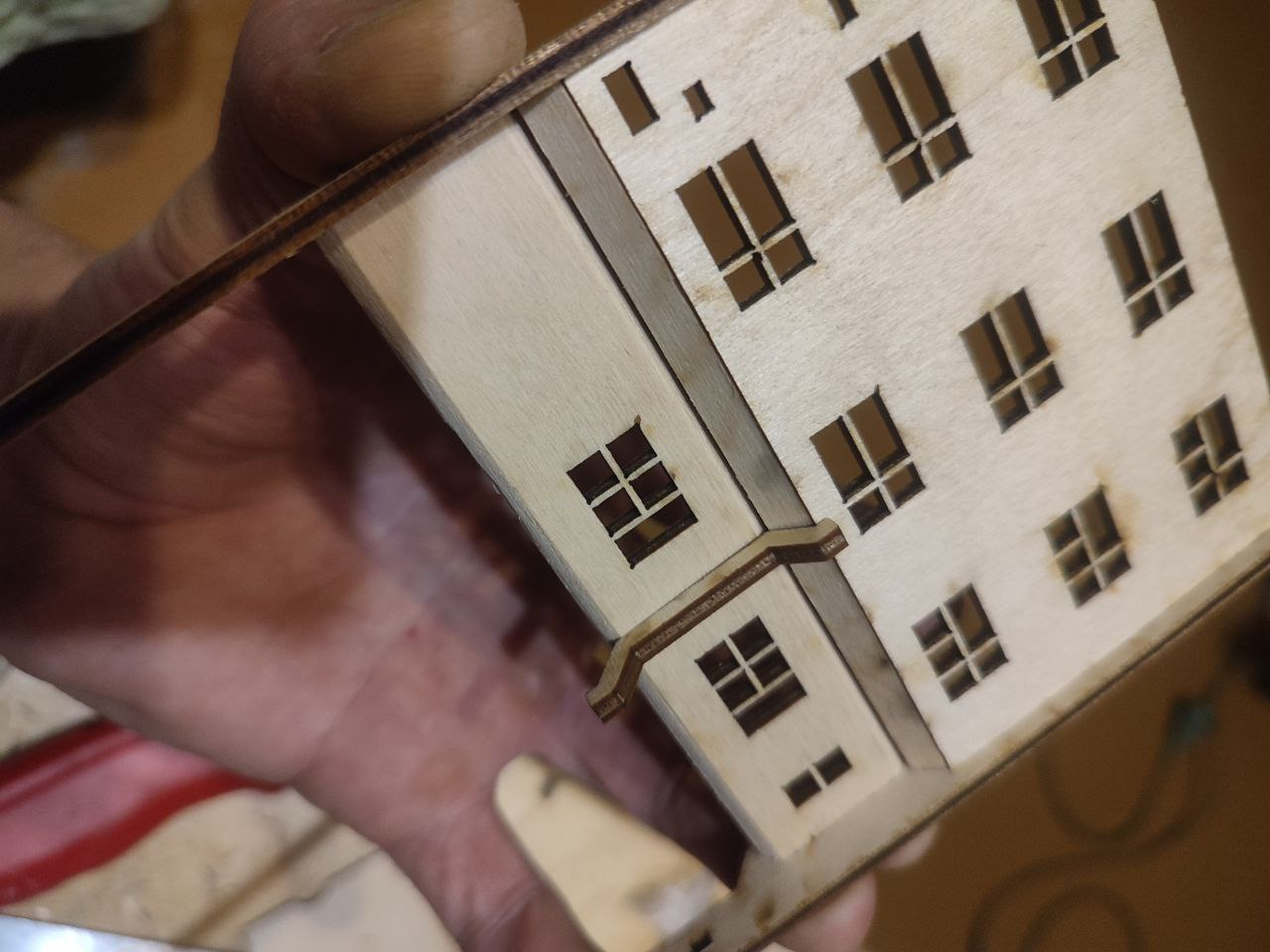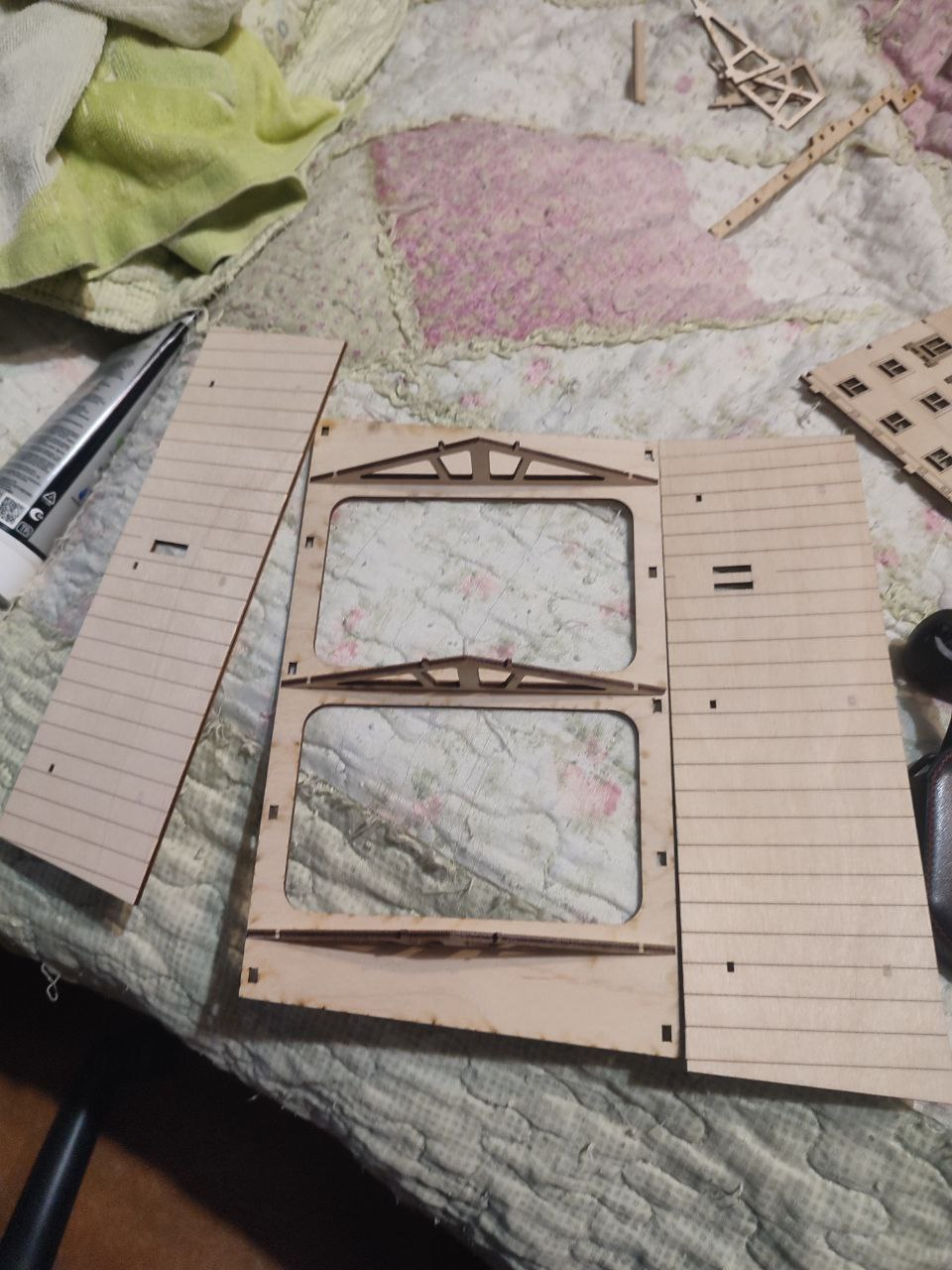 Прикидываю стену флигеля. Для склейки сделаны направляйки, в которые вставляются части крыши, для выдерживания геометрии стены при склейке. После полной склейки с нижней части стены шипы я срезал, а на верхние будет садиться крыша.