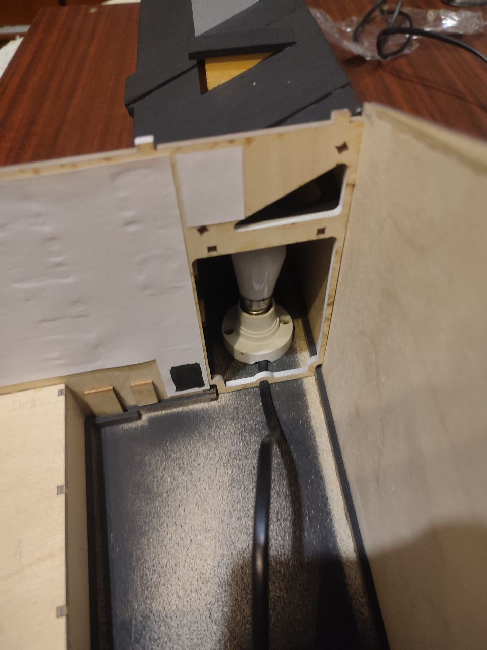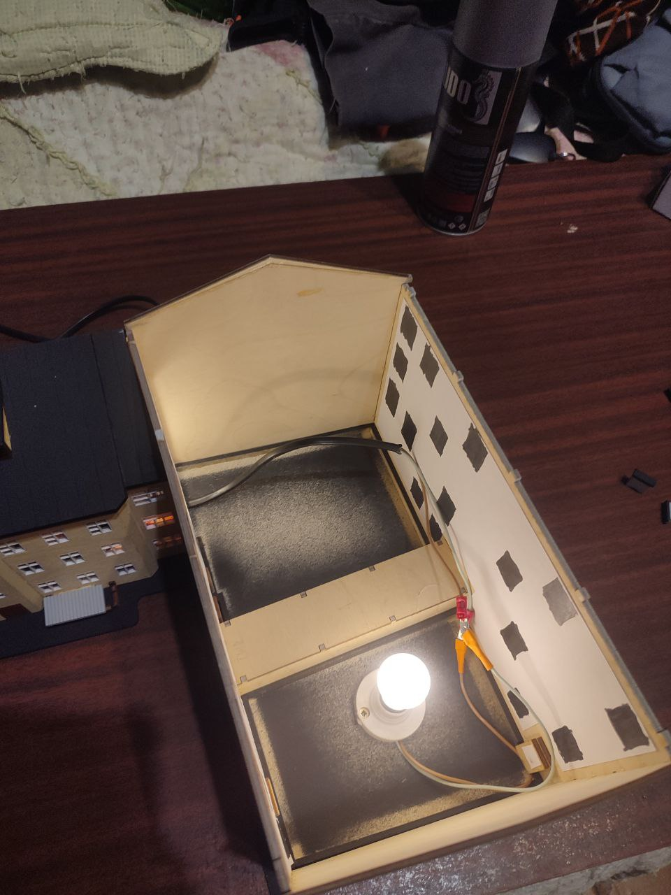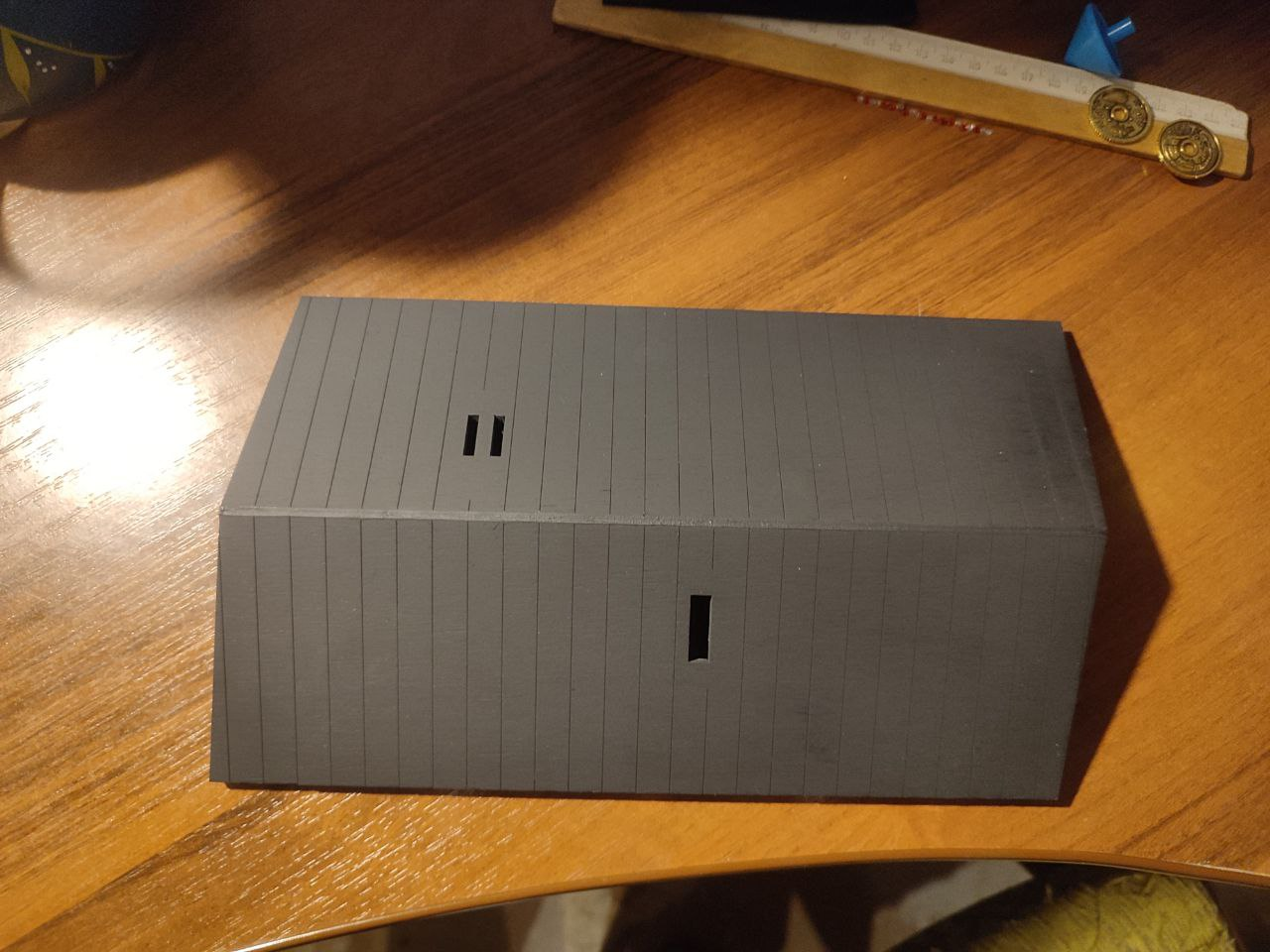 Прикидываю стену флигеля. Для склейки сделаны направляйки, в которые вставляются части крыши, для выдерживания геометрии стены при склейке. После полной склейки с нижней части стены шипы я срезал, а на верхние будет садиться крыша.