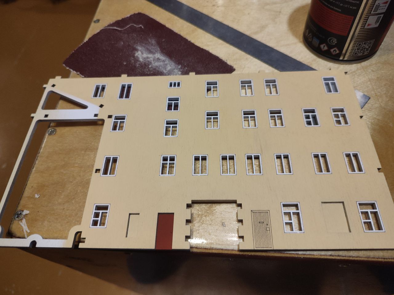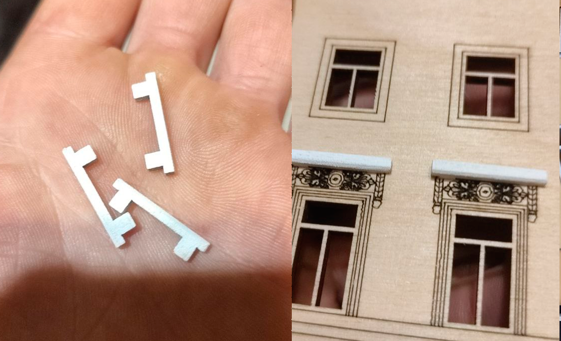 Сделаны и покрашены карнизики над окнами . Уменьшены ножичком на 1мм по толщине и снята фасочка.