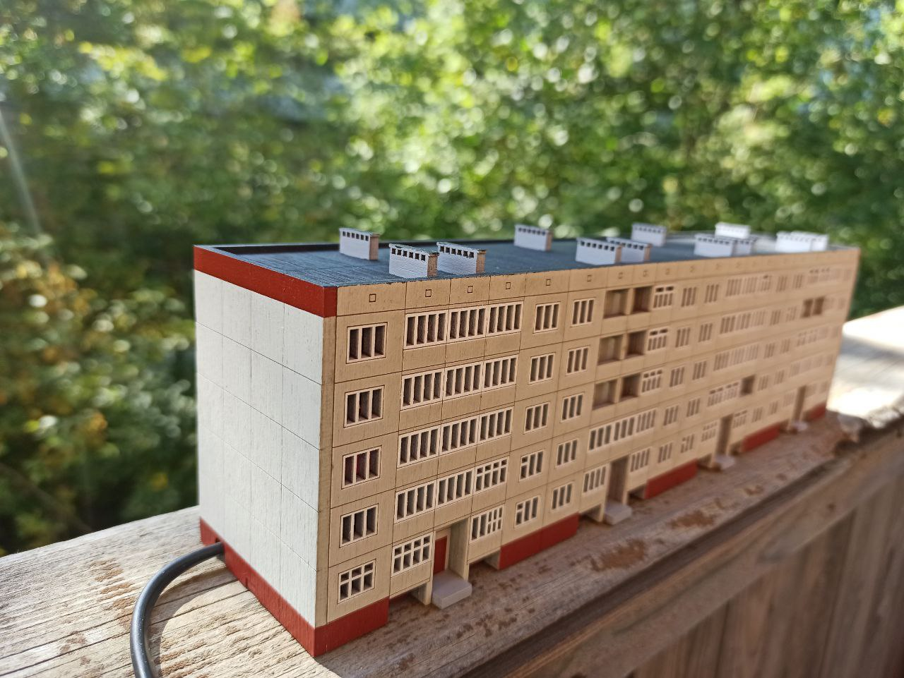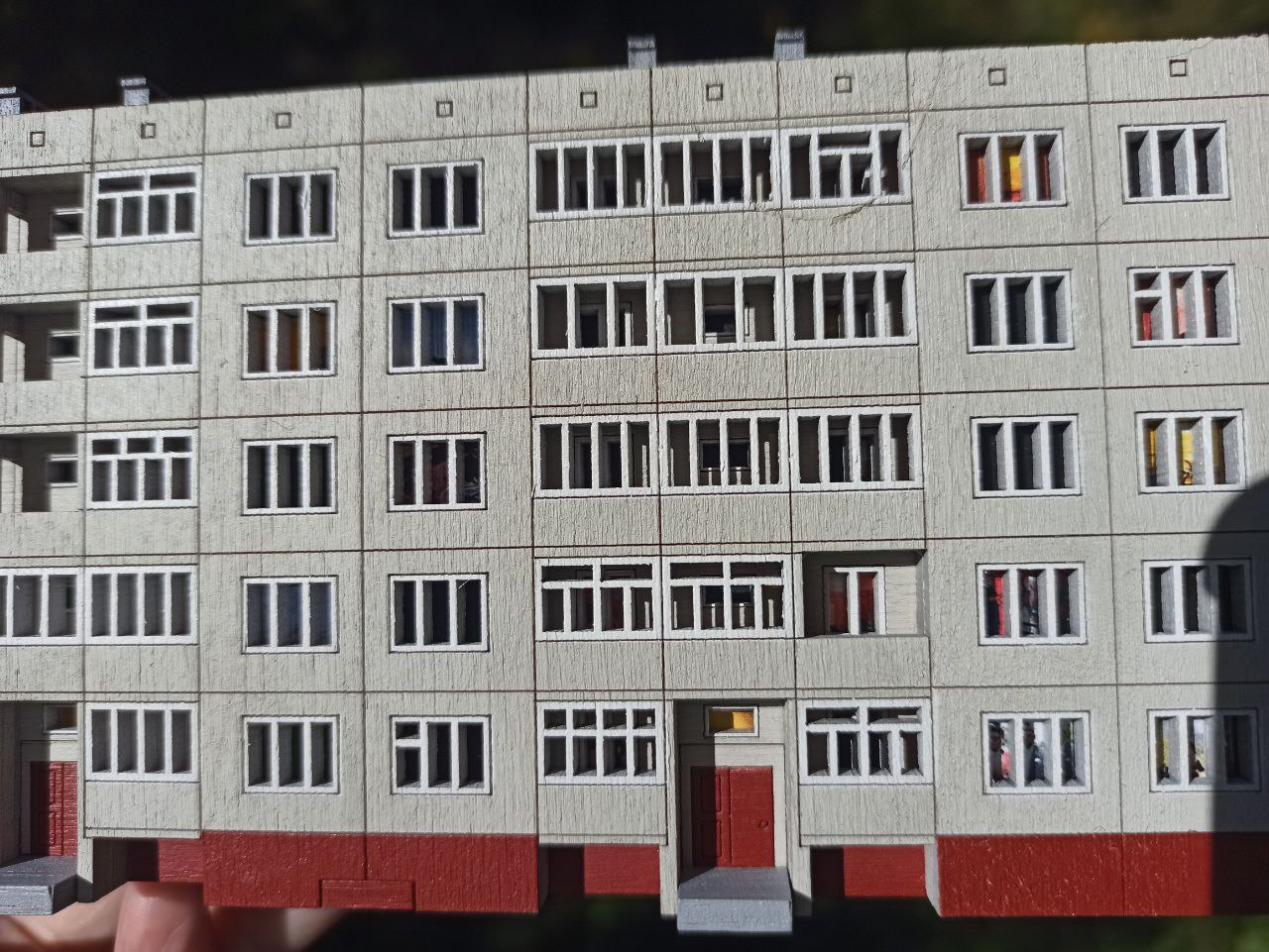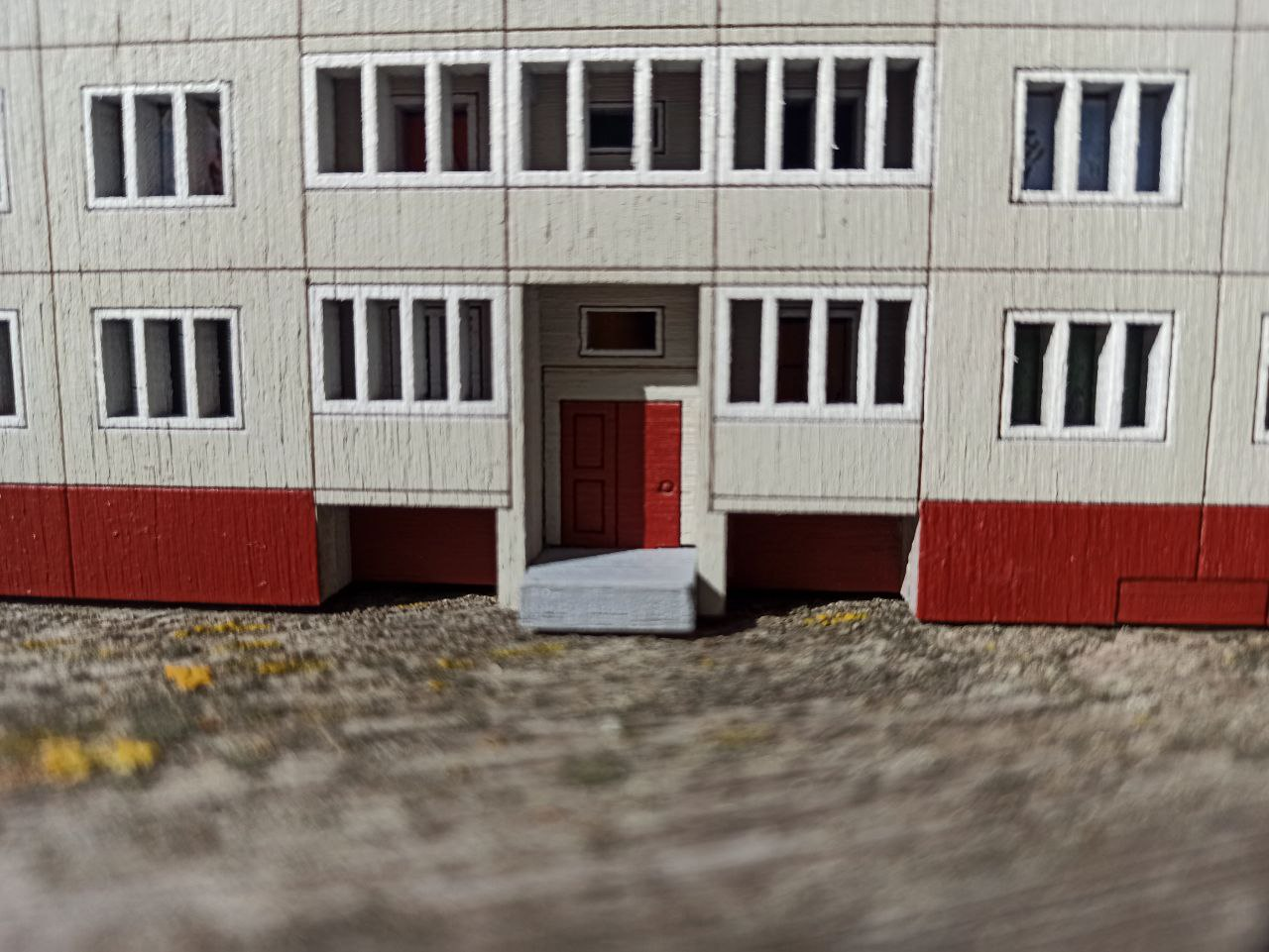 Дом сделан в масштабе 1к200. Фанера 3 мм толщиной, покрашен акрил красками вручную.