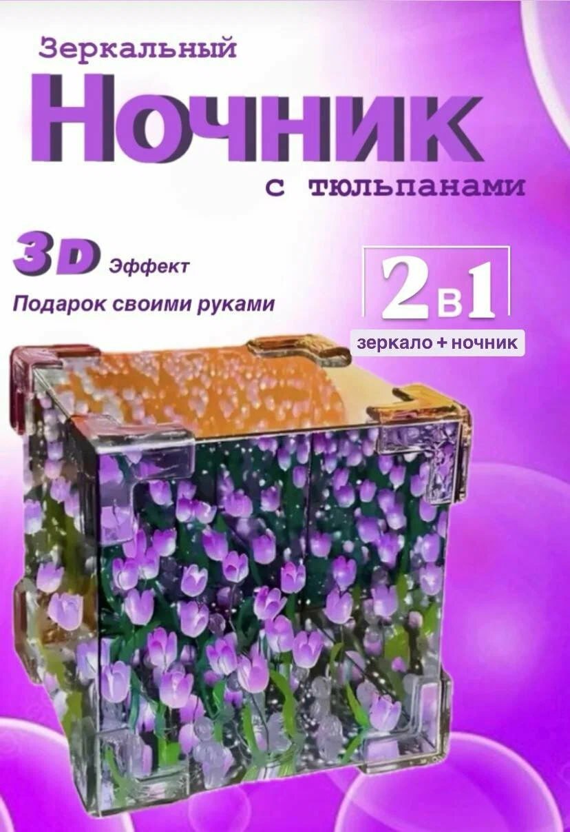 Романтичный ночник размером 12×12 см с эффектом зеркального куба! Когда свет выключен — это зеркало, а при включении раскрывается море тюльпанов, создавая волшебную атмосферу.