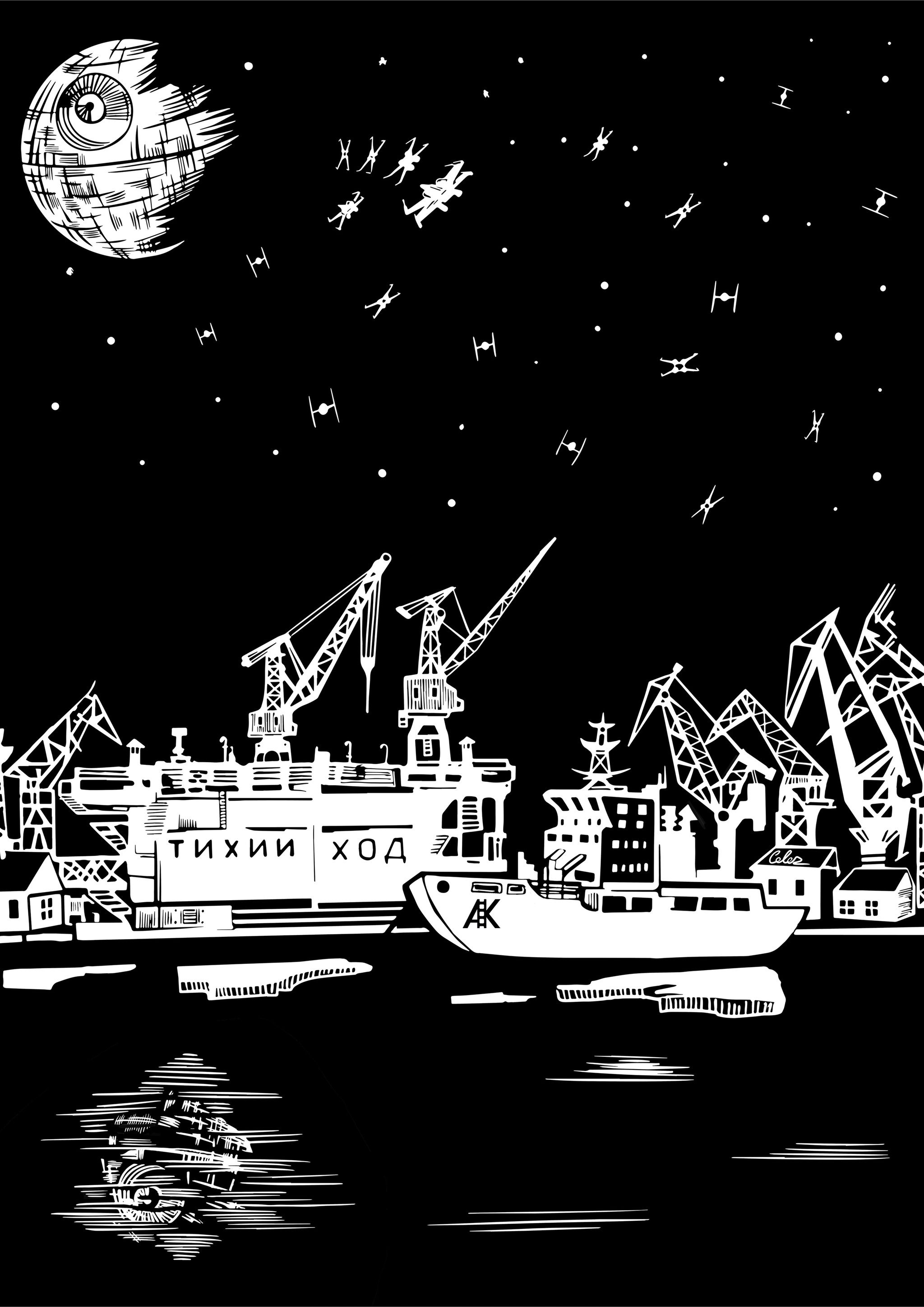 Постер создавался для фестиваля в Санкт-Петербурге, для АК Галерея. И моей задачей было - изобразить мотив какого-нибудь фильма в Питерском антураже . Я выбрал Звездные войны. Изображенные место располагается около наб. Лейтенанта Шмидта - это большущий плавучий док со множеством разномастных строительных кранов и надписью "Тихий ход".
