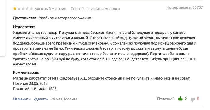 Здравствуйте, уведомляю Вас, пишу жалобу на Ваш магазин в роспотребнадзор. Приобретал у Вас фитнесс браслет xiaomi mi band 2, который не отвечает качеству, заявленному производителем. Вам будет направленно заказное письмо с заявлением на возврат товара, в случае отказа, буду подавать в суд, согласно Закону РФ от 07.02.1992 N 2300-1 (ред. от 18.04.2018) "О защите прав потребителей"