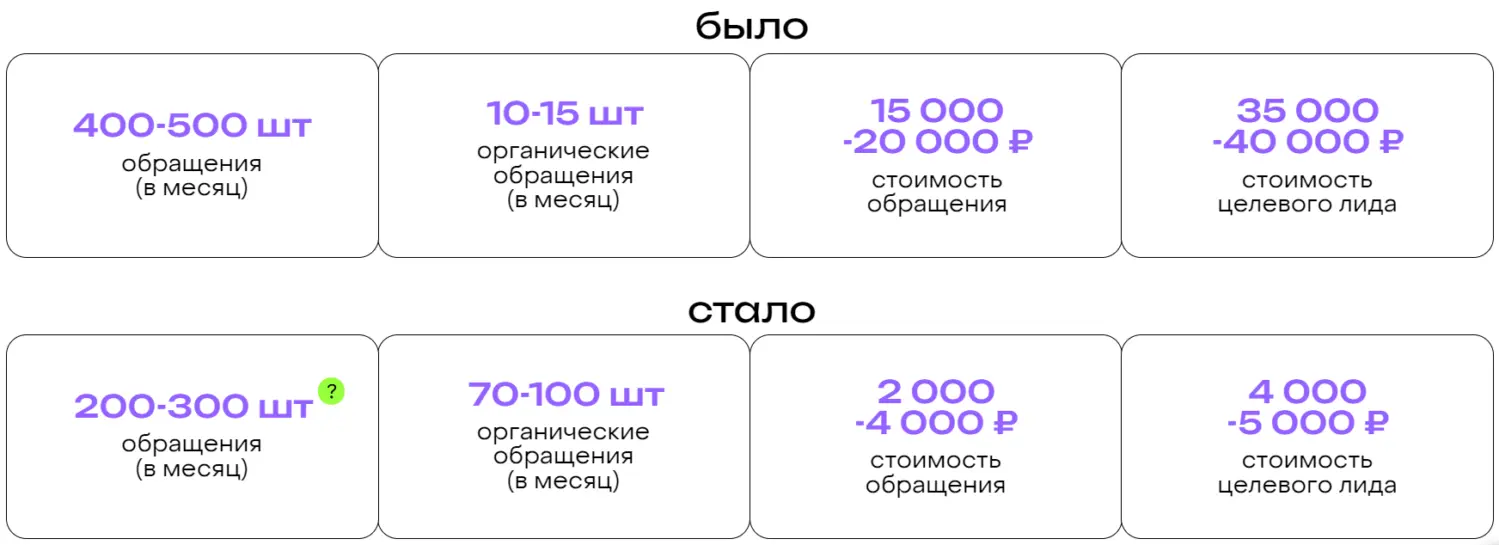 В итоге оптимизации мы делали упор на контекстную рекламу, SEO и ряд франчайзинговых площадок, которые приводят целевые лиды.