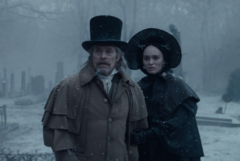 Актёрские работы тут вполне ожидаемо хороши. Что как всегда чудесный Николас Холт (который уже был под влиянием Дракулы в исполнении Николаса Кейджа совсем недавно), что Аарон Тейлор-Джонсон и Эмма Коррин в роли экранной пары (Эмма недавно ещё зажигала в третьем "Дэдпуле"), что Лили-Роуз Депп, которая выдаёт весьма убедительный перфоманс, что великолепный Уильям Дэфо, который теперь играет местного Ван Хельсинга. Однако, понятное дело, что главное блюдо в фильме — это граф Орлок. Его образ до премьеры держали в секрете, так что никто даже не знал, что выглядеть он будет уже совсем не как нечисть из 1920-х (и потом много где ещё засветившаяся, от "Участи Салема" до "Что мы делаем в тенях"). В итоге же графа сделали практически ожившим трупом Влада Цепеша, с крупным носом и густыми усами а-ля Фредди Меркьюри. Подход интересный и смотрится он в кадре очень внушительно. А уж то, как эту роль исполняет Билл Скарсгард — это вообще сплошные комплименты.