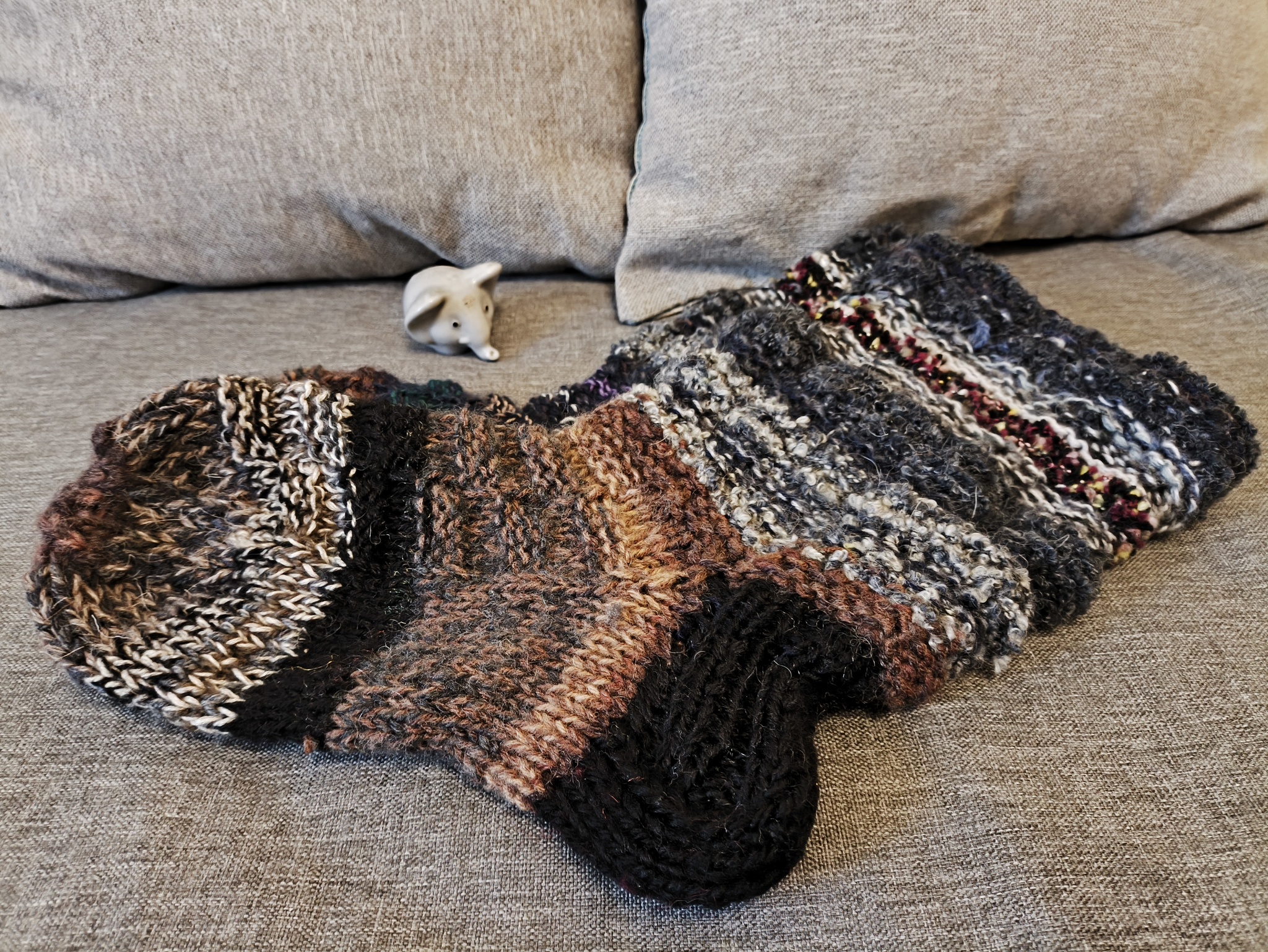 За год, как показал мой предновогодний вязальный опрос, ноги у молодого поколения выросли до гигантских размеров. Мамонты просто. Но благодаря растущим этим организмам, доброго им здоровья, я увидела все-таки дно своего мешка с остатками пряжи!