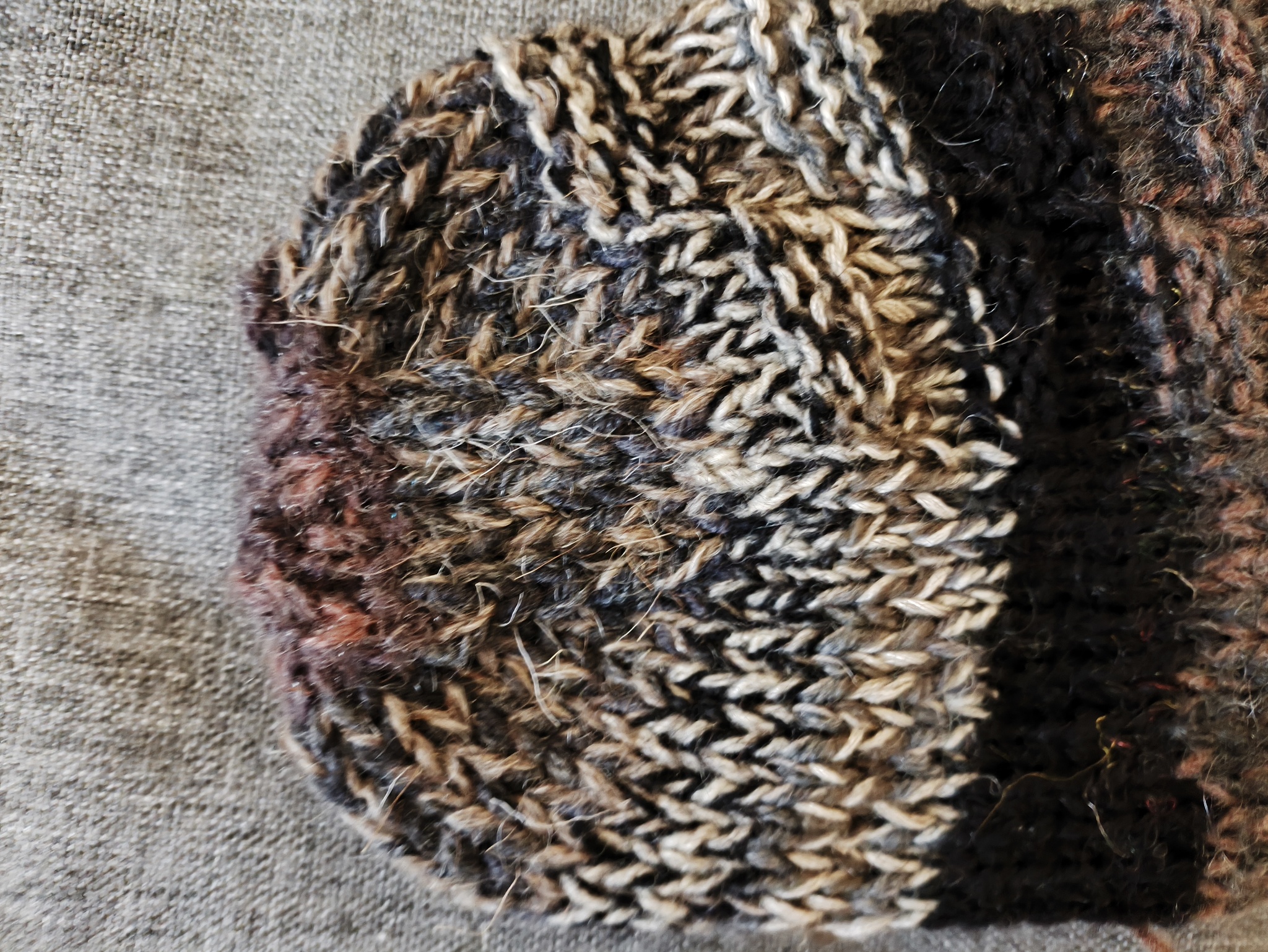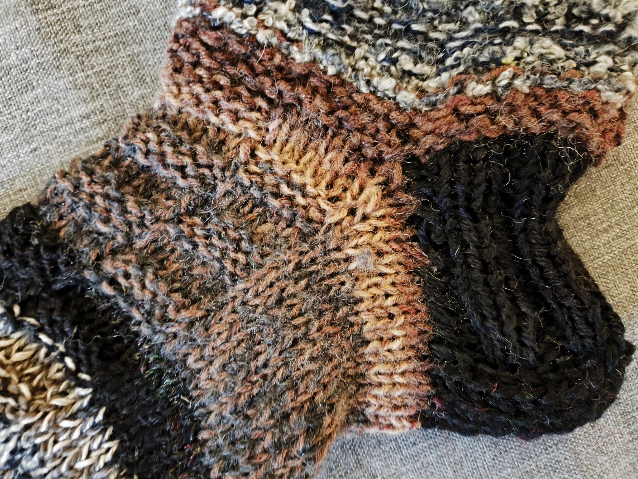 Начинаем с гладкой пряжи, через пару рядов в дело пускаем фасонную и полосами разного цвета вяжем резинку до начала пятки.