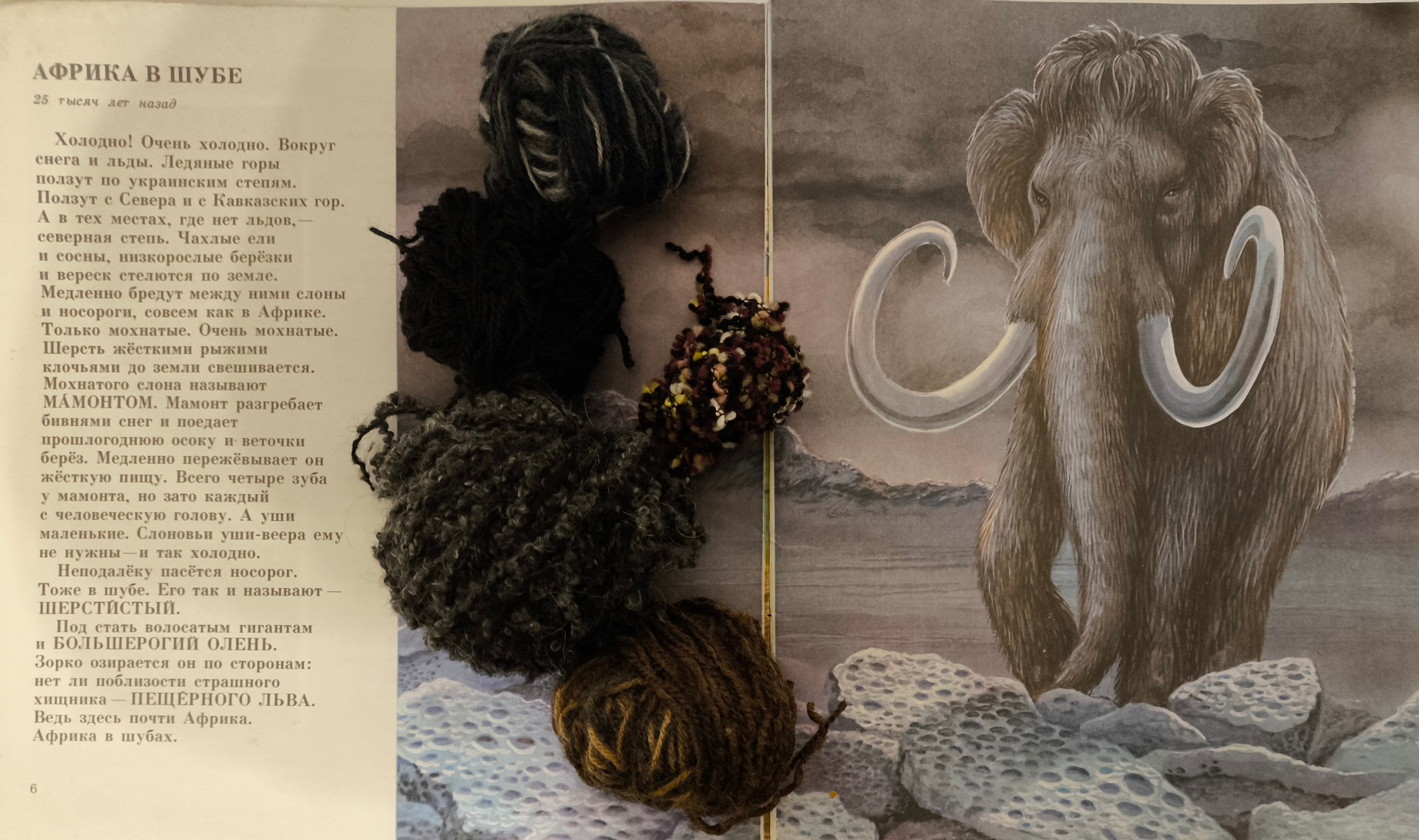 Сматываем вместе всякие остатки пряжи, пустим в дело и клубочек фасонной пряжи. Мамонт будет основательный, шерстяной, холодов не убоится.