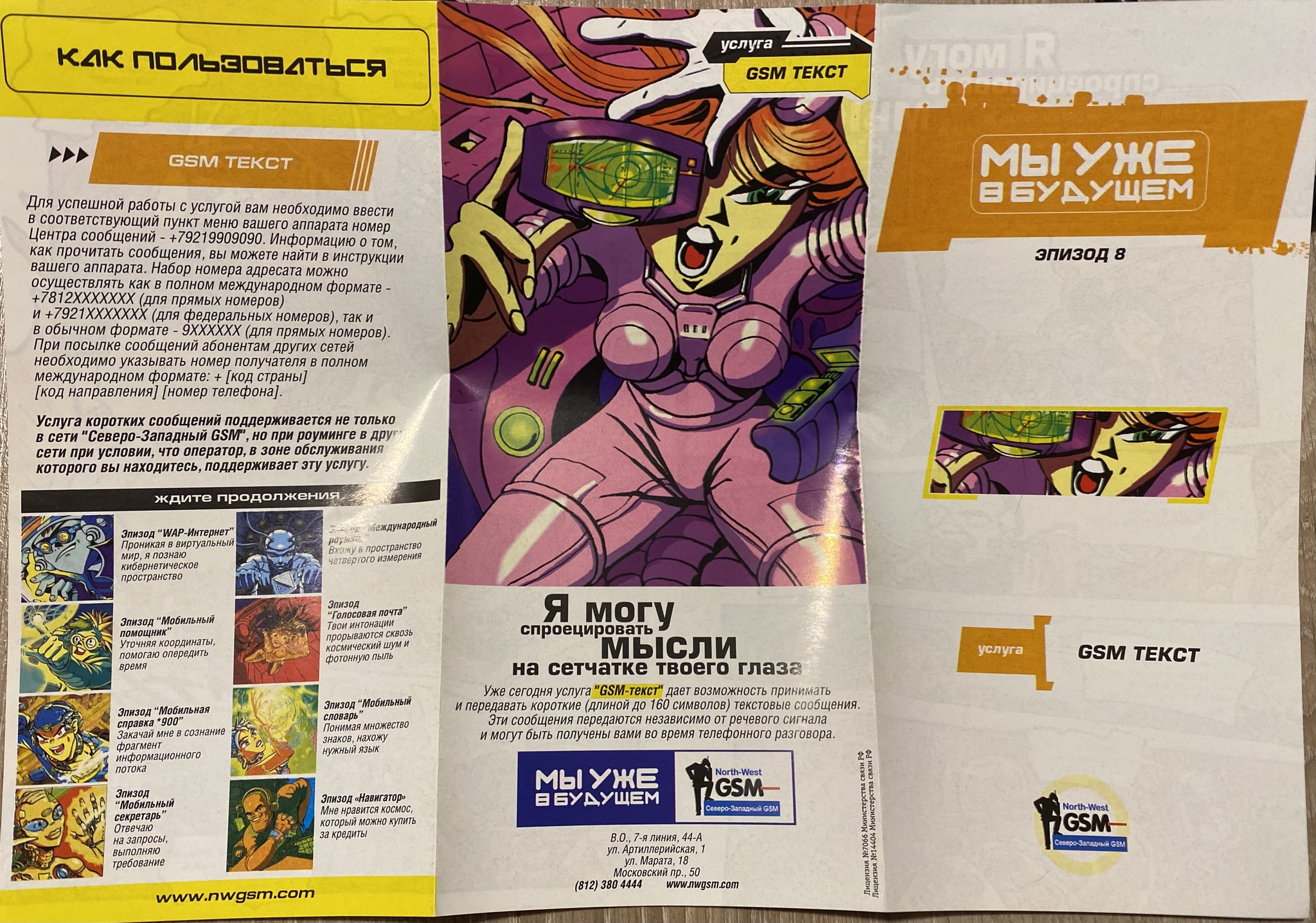 Сегодня из моего архива вылезла реклама СМС сообщений от Северо-Западного GSM. До 2002 года так назывался Мегафон. Как видим, будущее ещё не наступило. И ни смс, ни мессенджеры мы на сетчатку глаза пока так и не выводим :)