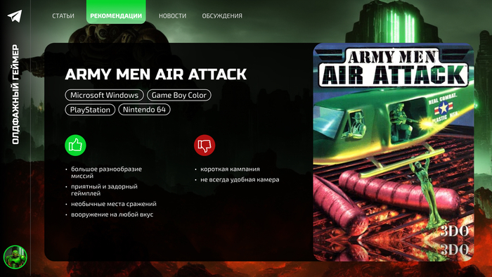 Если же подойти к проекту с поправкой на возраст, то без каких-либо сомнений он подарит вам настоящее удовольствие от процесса! Тем более, что сегодня не нужно бегать по магазинам в поисках заветной коробочки с игрой — в интернете есть всё. Ну а чтобы упростить вам эту задачу ещё сильнее, в Телеграм-канале «Олдфажный геймер» я выложил готовую сборку Army Men: Air Attack, причем и с русской, и с английской локализацией, чтобы вы могли скачать и тотчас погрузиться в ностальгию!