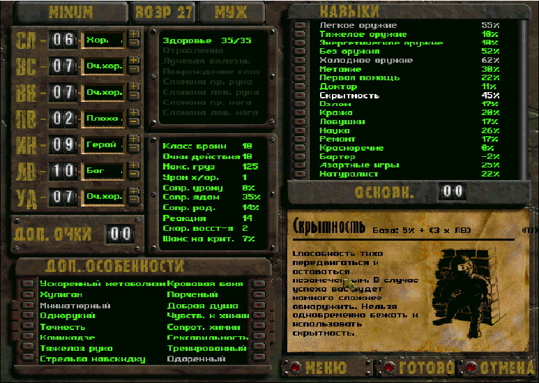 Система создания вашего альтер эго является одной из важнейших особенностей, и то, каким вы создадите его, повлияет на последующее приключение. Ролевая система называется S.P.E.C.I.A.L., где каждая буква – первая буква названия характеристики.