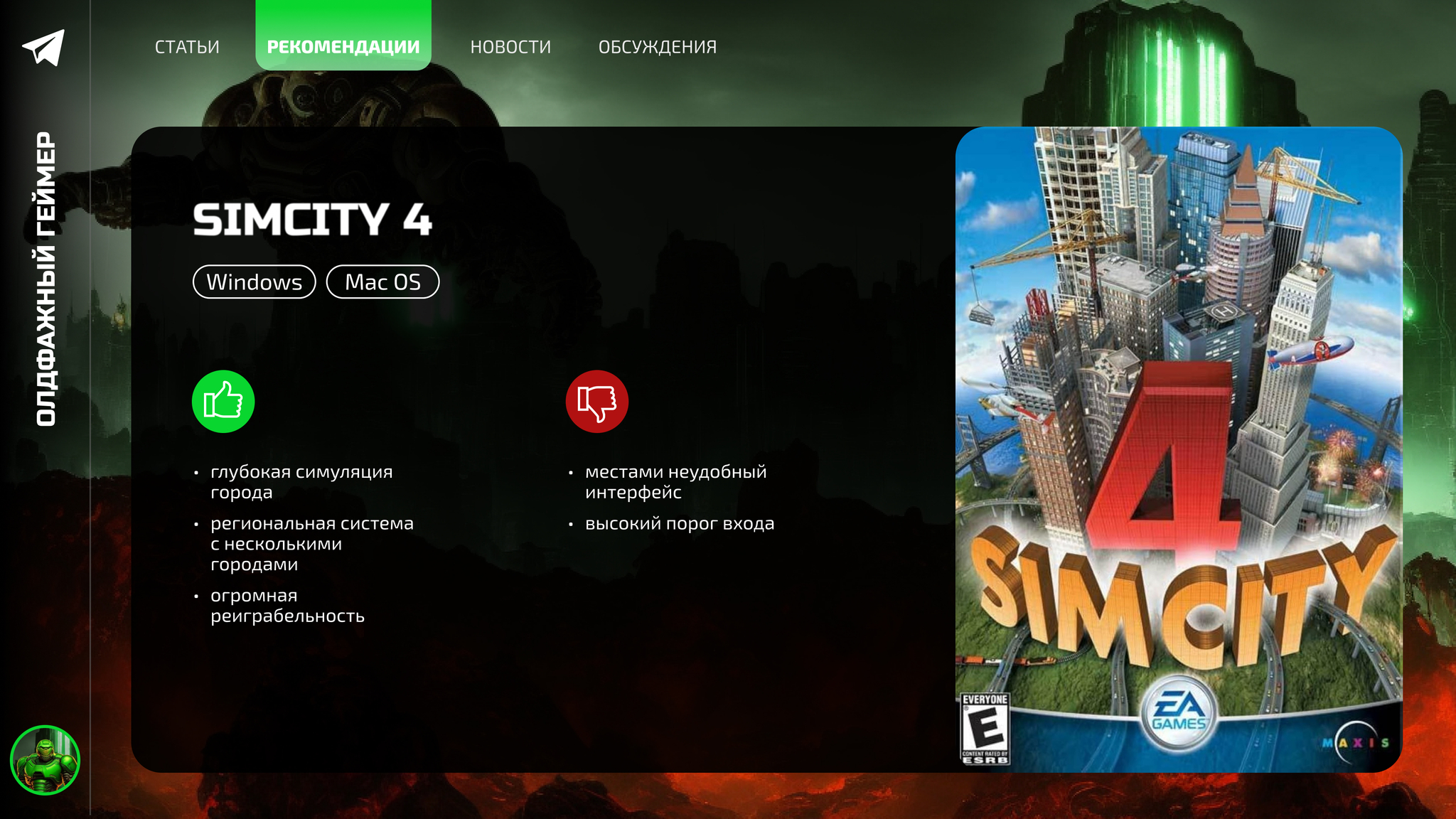 Я играю в игры больше 25 лет и запомнил их именно такими: душевными и затягивающими, с увлекательными механиками и интерактивностью, без внутриигровой валюты и попыток быть чем угодно, но не игрой. В моём Telegram канале тебя ждут не только обзоры на игры, но и актуальные новости, а также рассуждения о геймдеве. Присоединяйся к сообществу олдфагов!