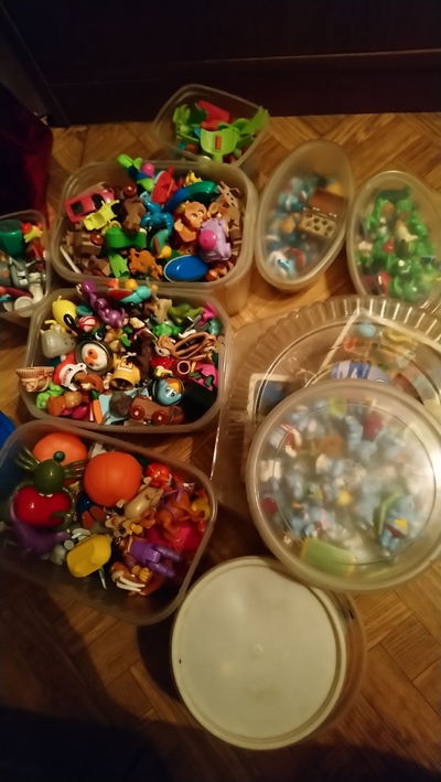 Нашлись герои мультфильмов, а так же, частично обнаружились вот такие киндеровские "собирайки", где детали от разных игрушек подходят друг к другу и можно собрать какую-нибудь дикую наркоманию.