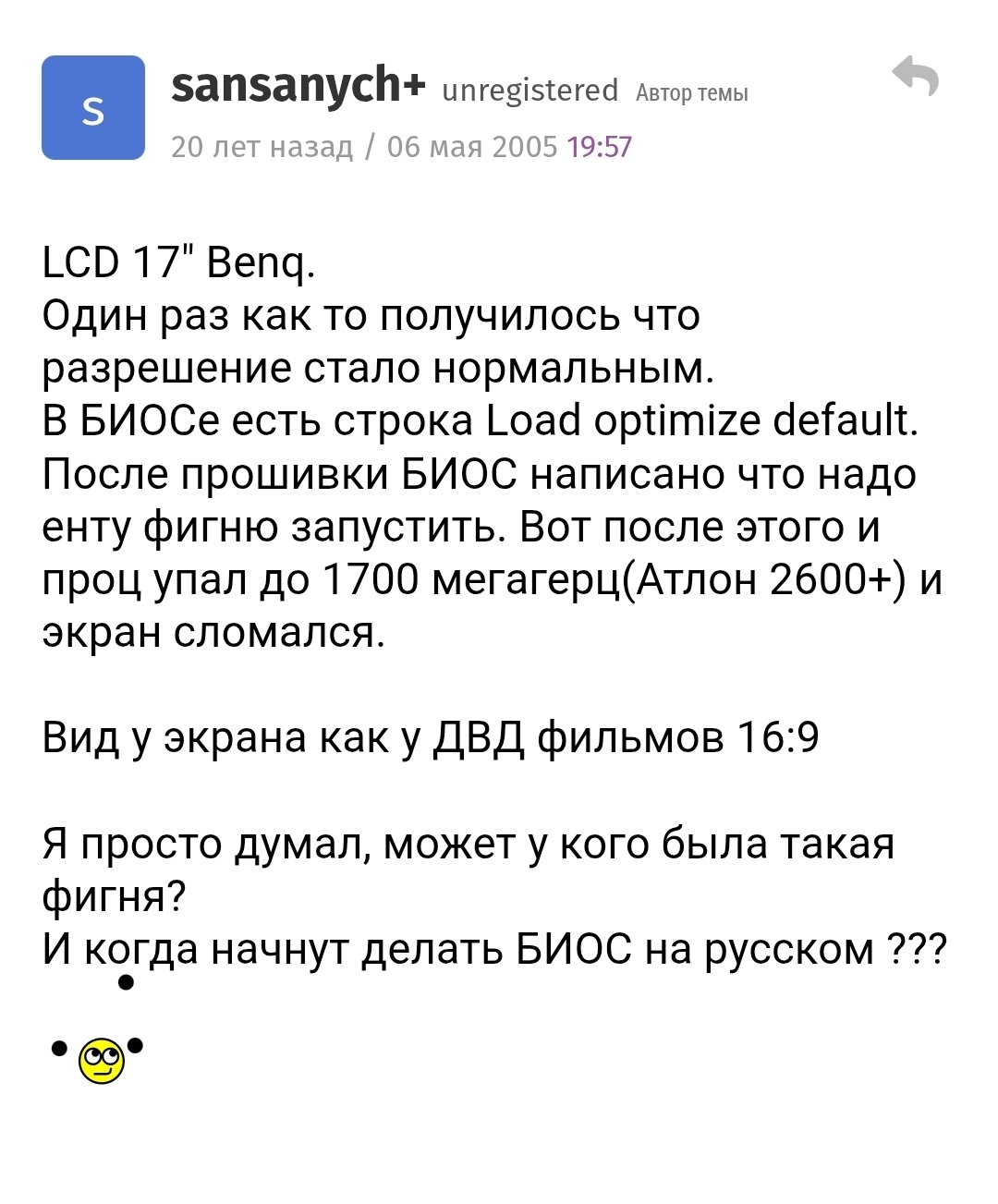 И биос у меня на русском и монитор 32 уже... да и в смартфоне крутится снапдрагон мощнее этого атлона. А радости нет, захотел в 2005й и снова чтобы нокиа 6630 в руках, а не вот это вот всё.