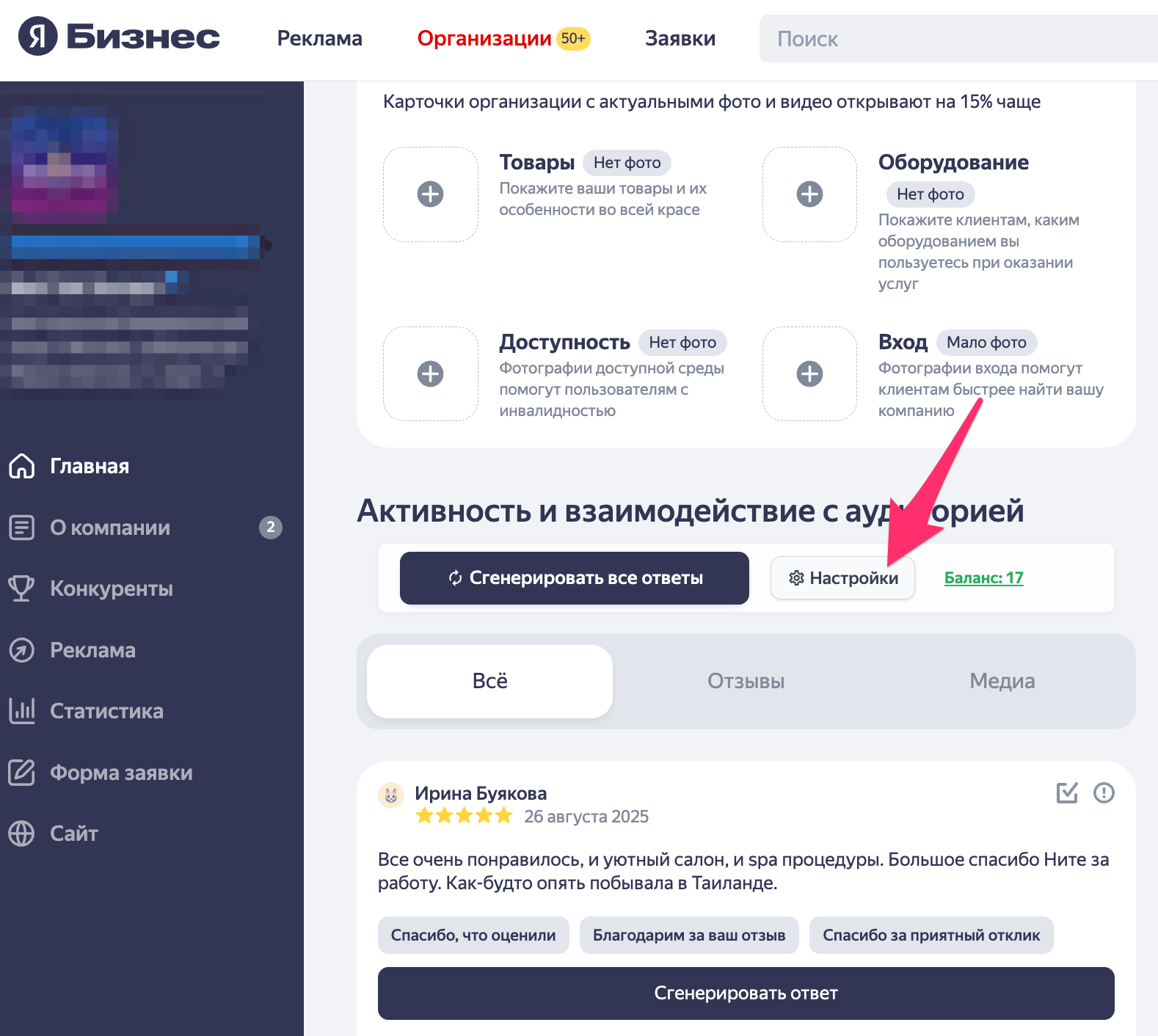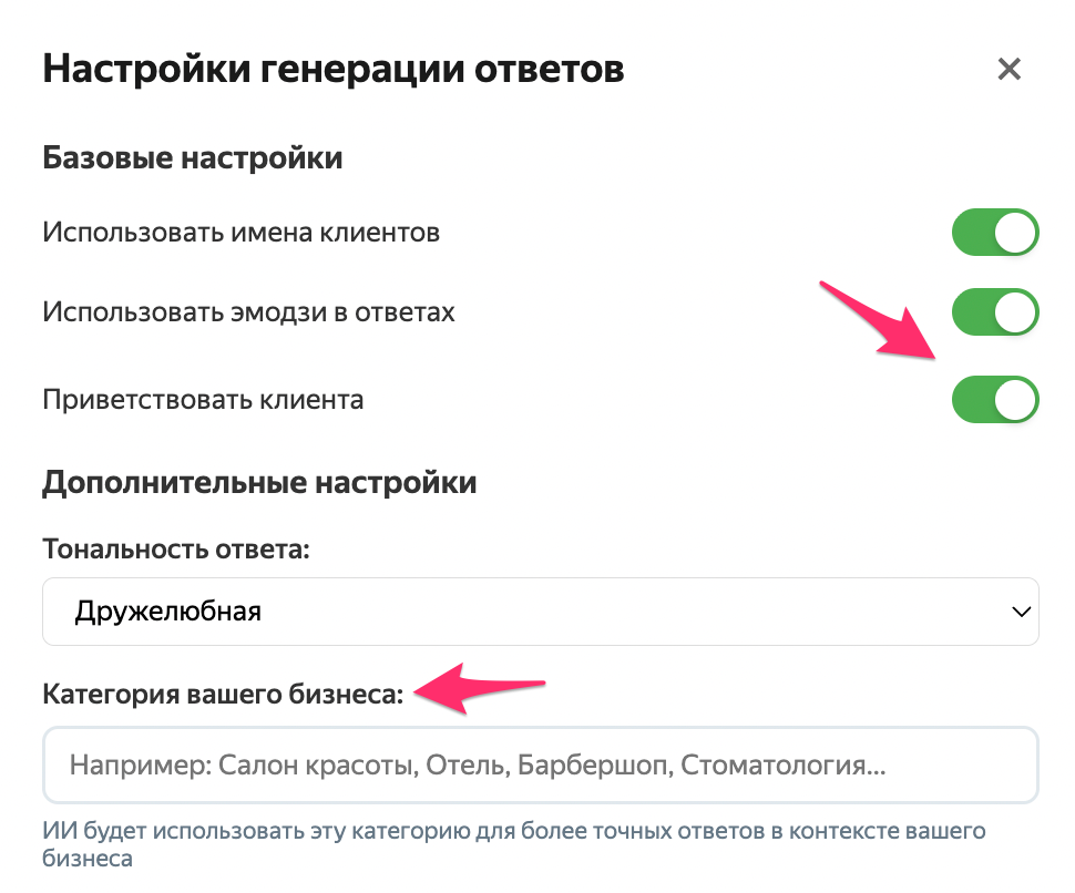 Рекомендую указать категорию вашего бизнеса в "Настройках", так ответы будут точнее, хотя это совсем необязательное действие: