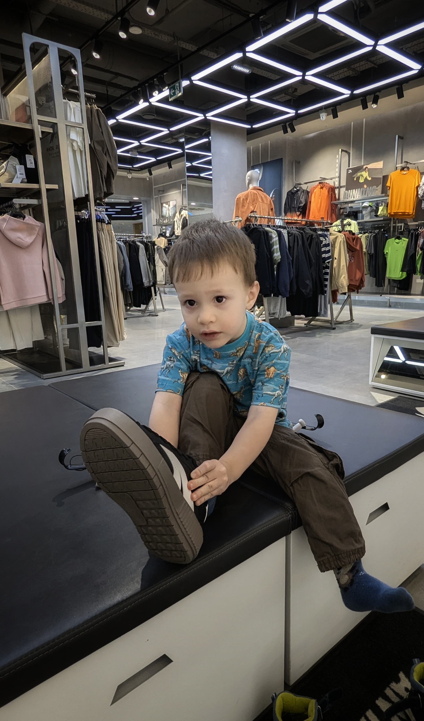 А вот обуви ему маловато 🤣. С криками: "Мама, мне нужны новые кроссовки!", сын кинулся примерять понравившуюся пару.
