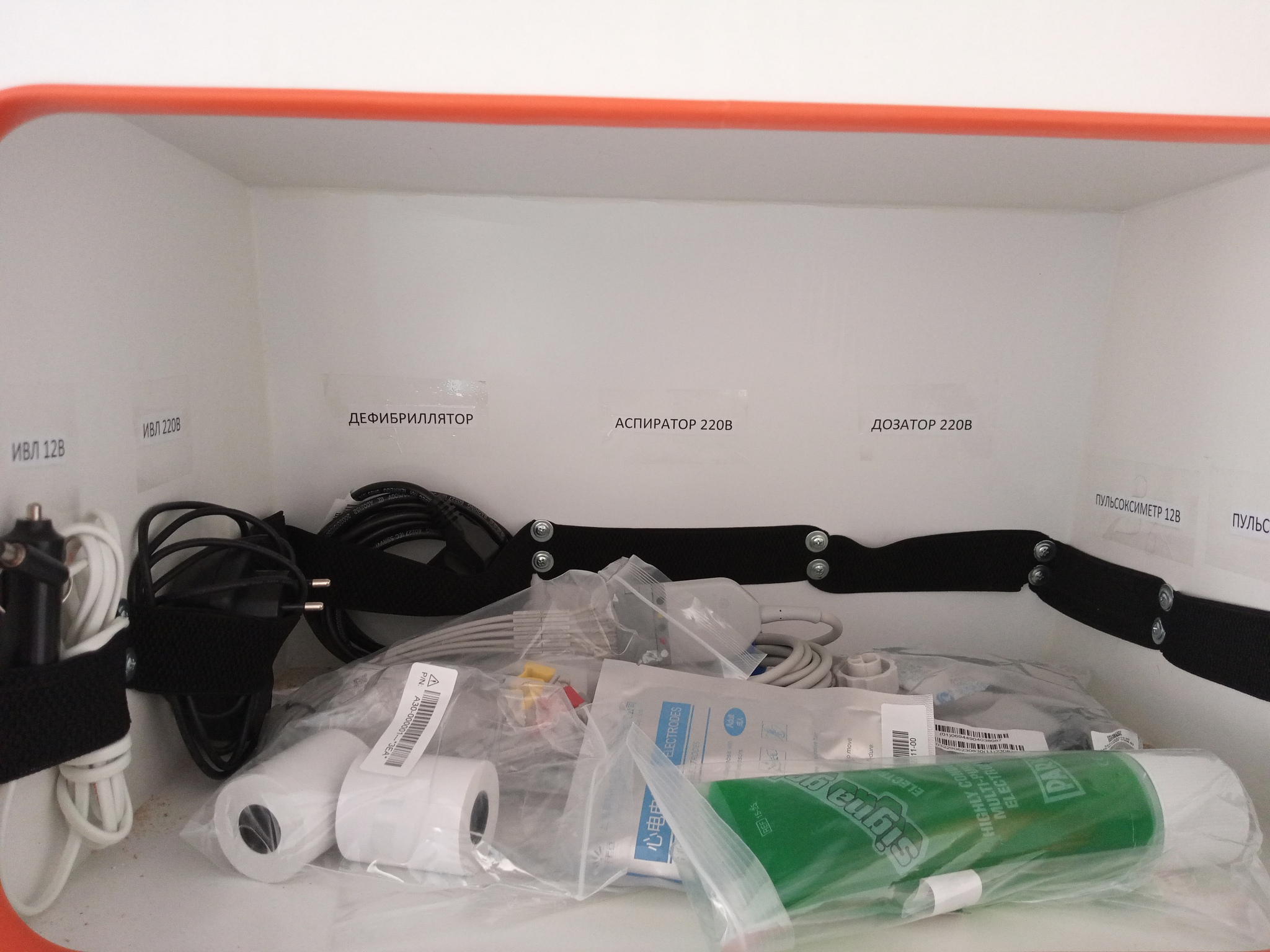 К каждой единице медтехники прилагается шнур питания либо зарядное устройство. Часто по два - на 12 и 220 В. Нужно их разместить удобным образом. Поэтому в запирающемся шкафчике крепим эластичную ленту и снабжаем ячейки подписями.