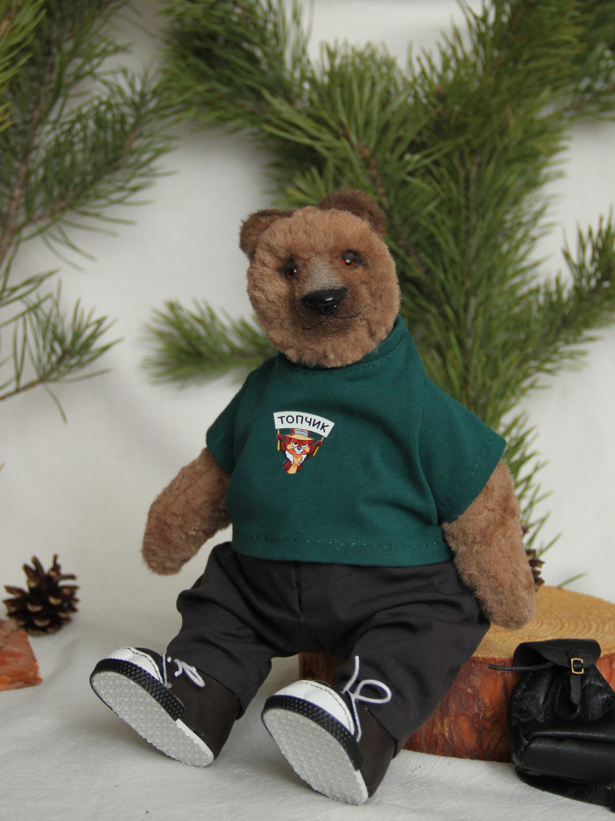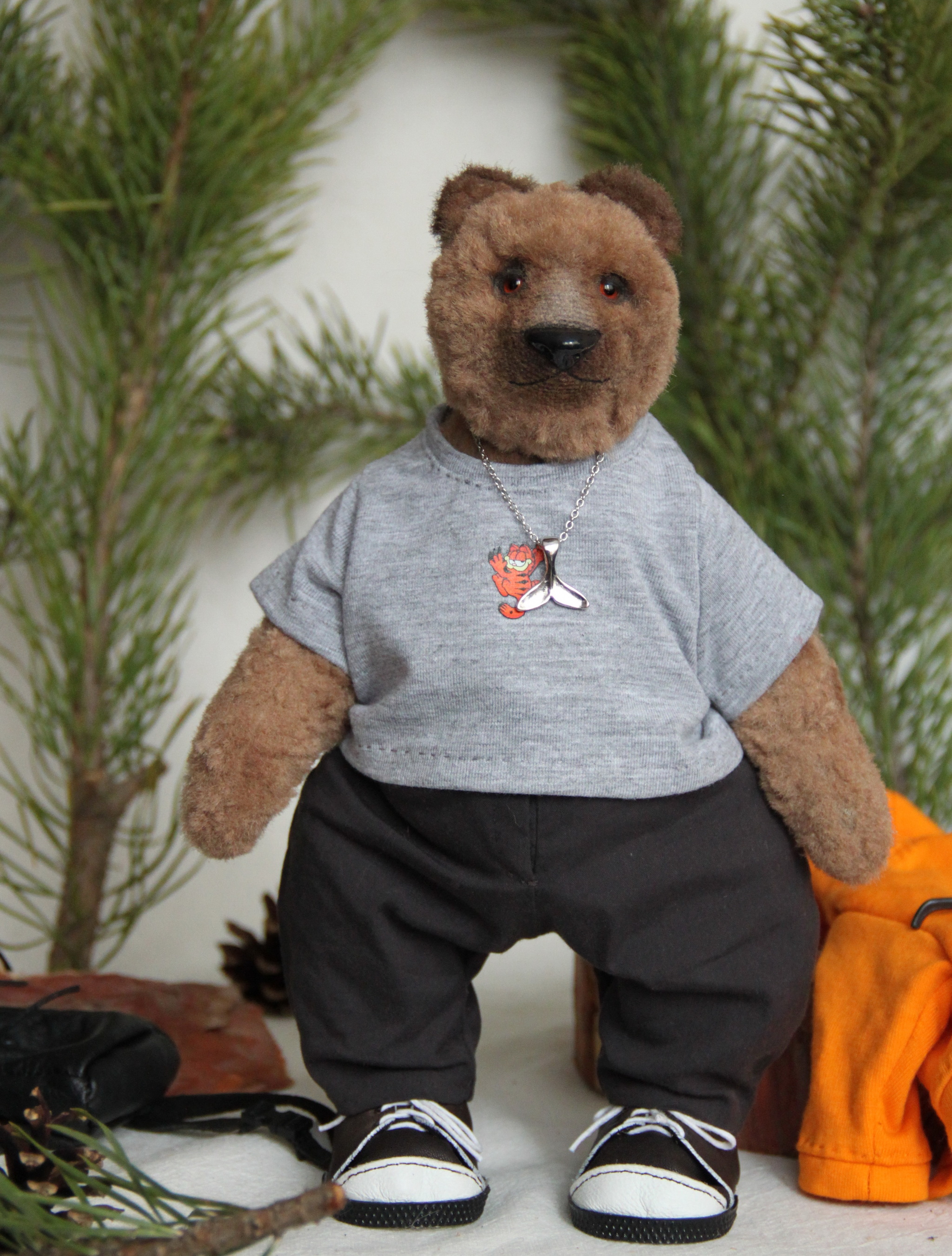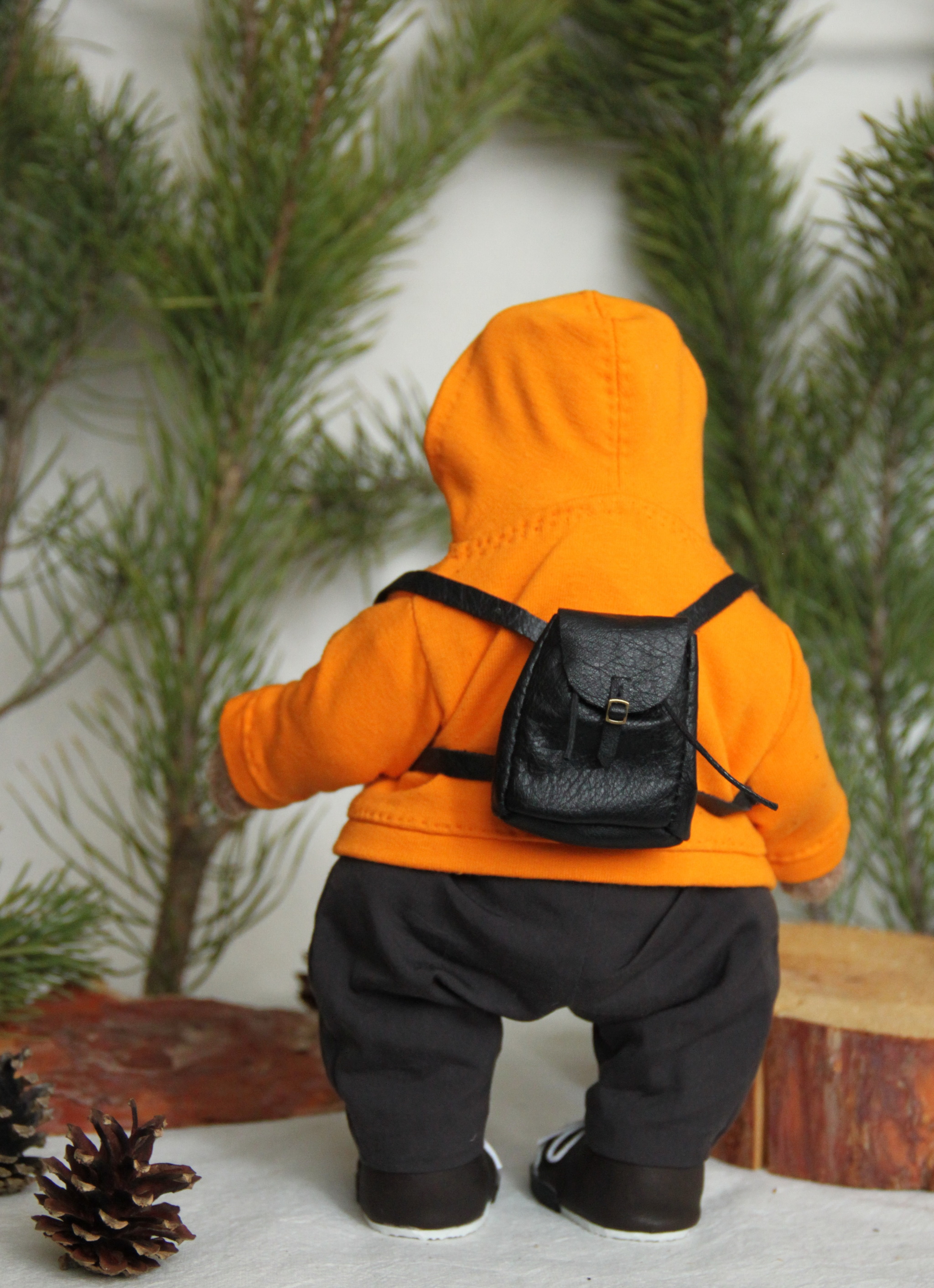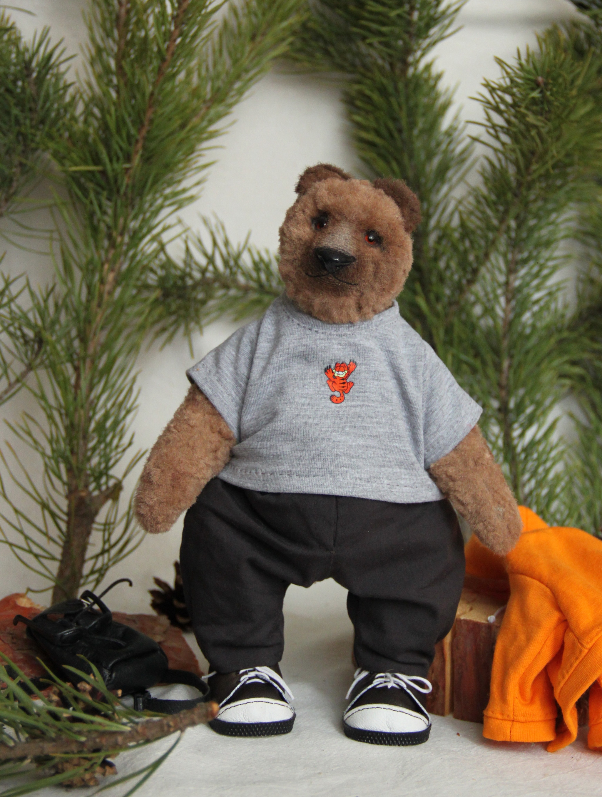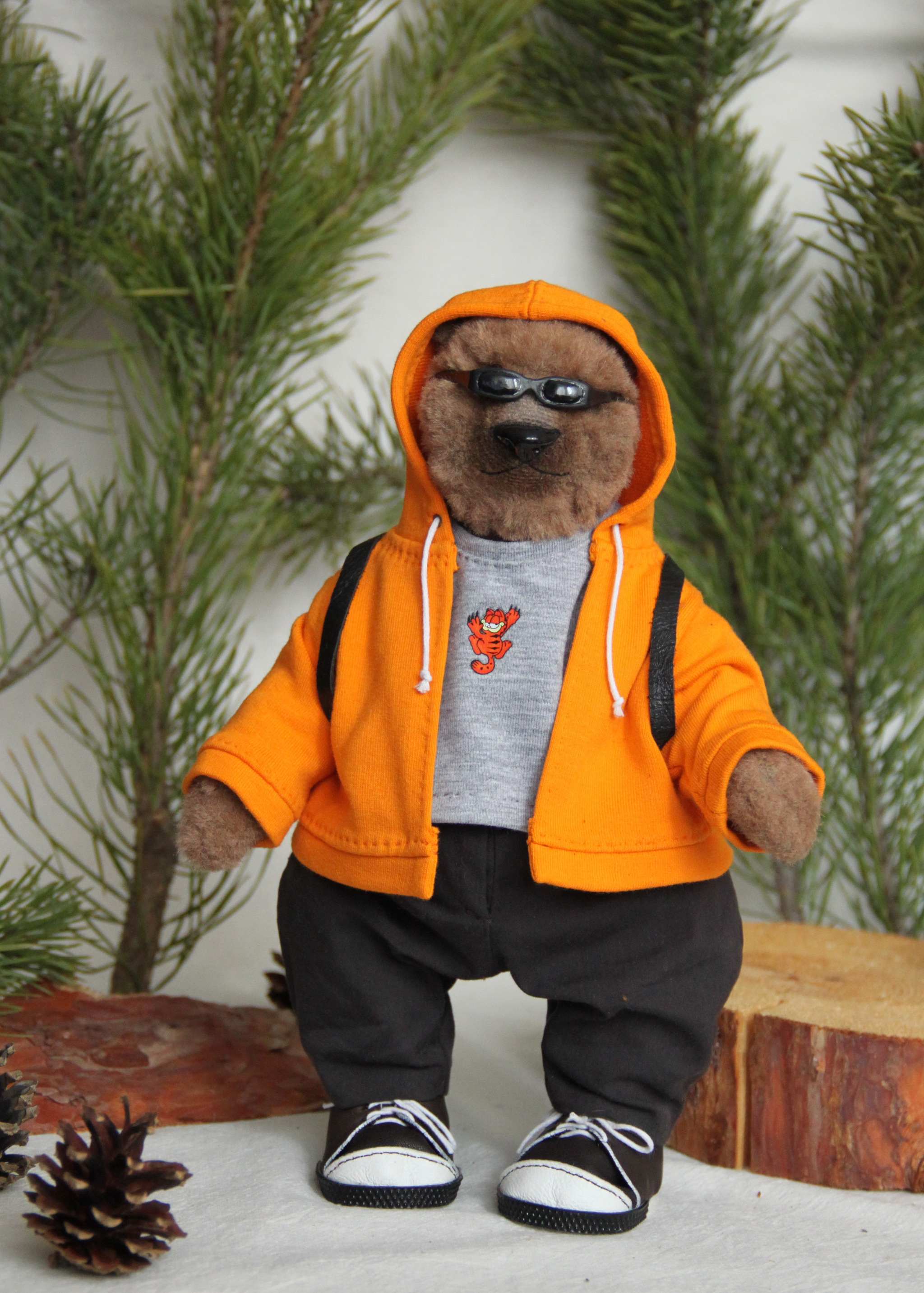 Шился миша долго и кропотливо, потому как вроде наряд простой - но его же надо подогнать по выкройке, под формы именно данной игрушки, продумать все детали, технологию пошива, посадку, плюс сделать все так, чтобы это было аккуратно... придумать, как сделать именно кроссовки в таких масштабах, а не просто ботинки... с рюкзачком тоже морока (вы пробовали шить кожу?))))