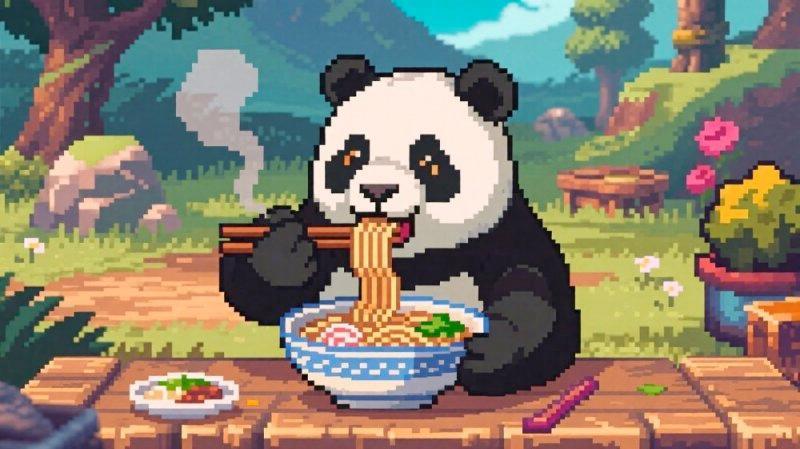 панда кушает лапшу из миски <lora:1938784:1> pixel art in 2dhd octopath traveler style