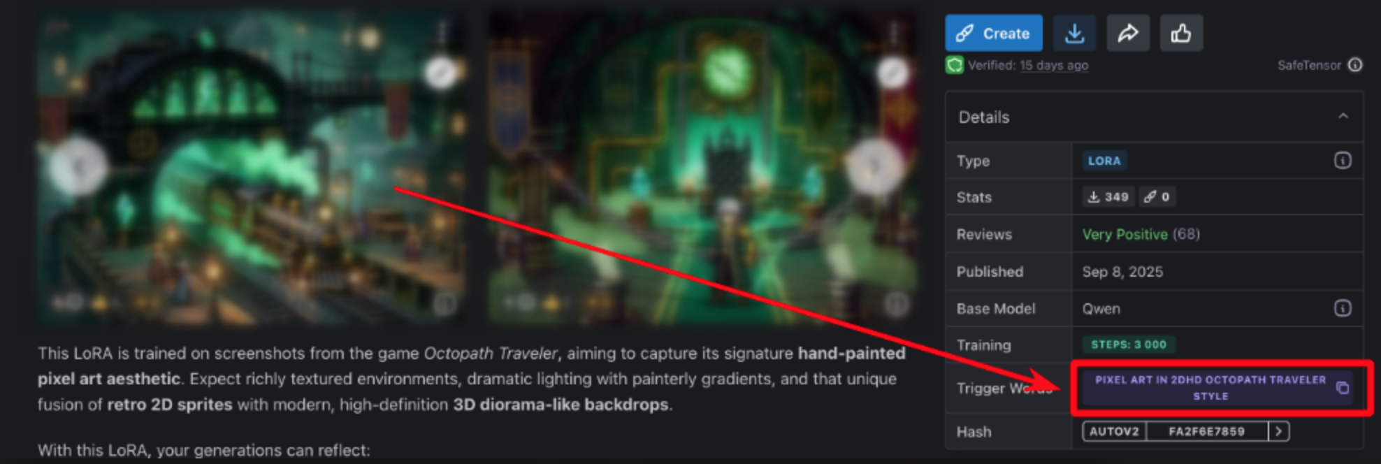 Открываете список моделей — выбираете ту, что подходит по стилю и набору функций. Не ленитесь заглянуть в описания: авторы обычно подробно разбирают, что умеет каждая LoRA-модель на практике. Как только определились, кликаете на карточку, копируете ссылку из браузера, например: https://civitai.com/models/1938784/2dhd-pixel-art-octopath-s...