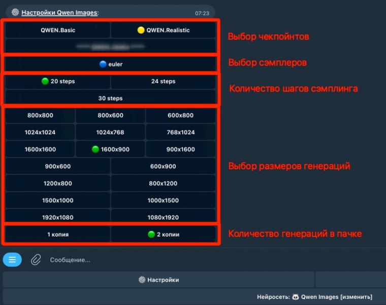 В настройках подбираем параметры под себя: выбираем подходящий чекпойнт (версию модели). Устанавливаем количество шагов генерации — для большинства задач достаточно 20 шагов, этого хватает с головой. По желанию можно задать размер изображения в пикселях и определить, сколько картинок бот сделает за один раз.