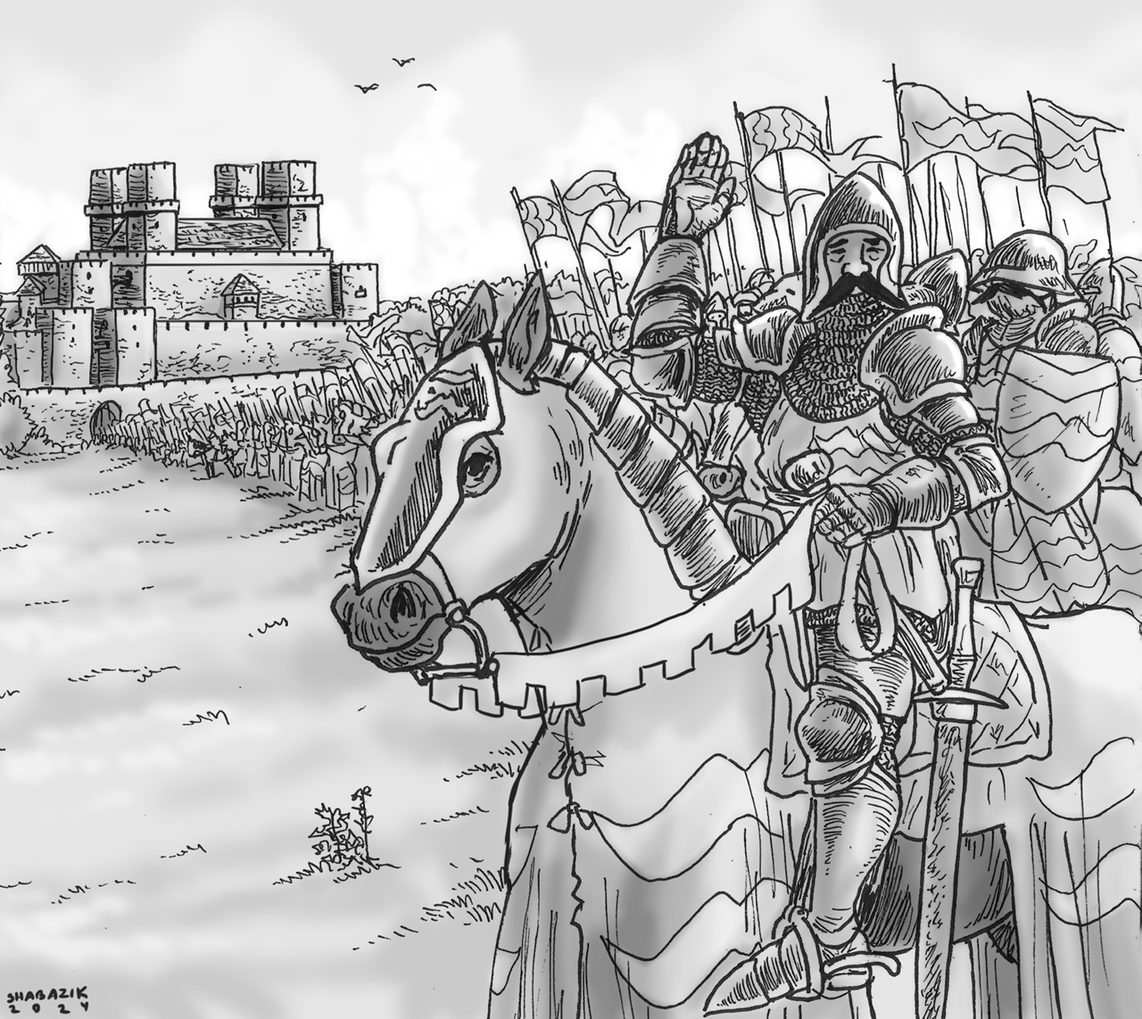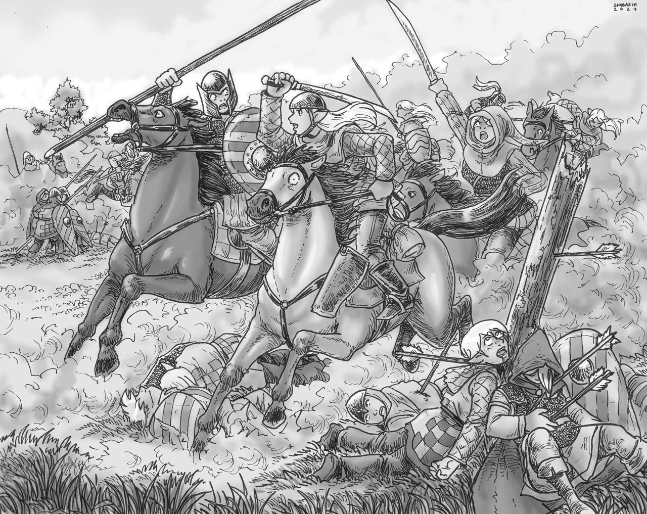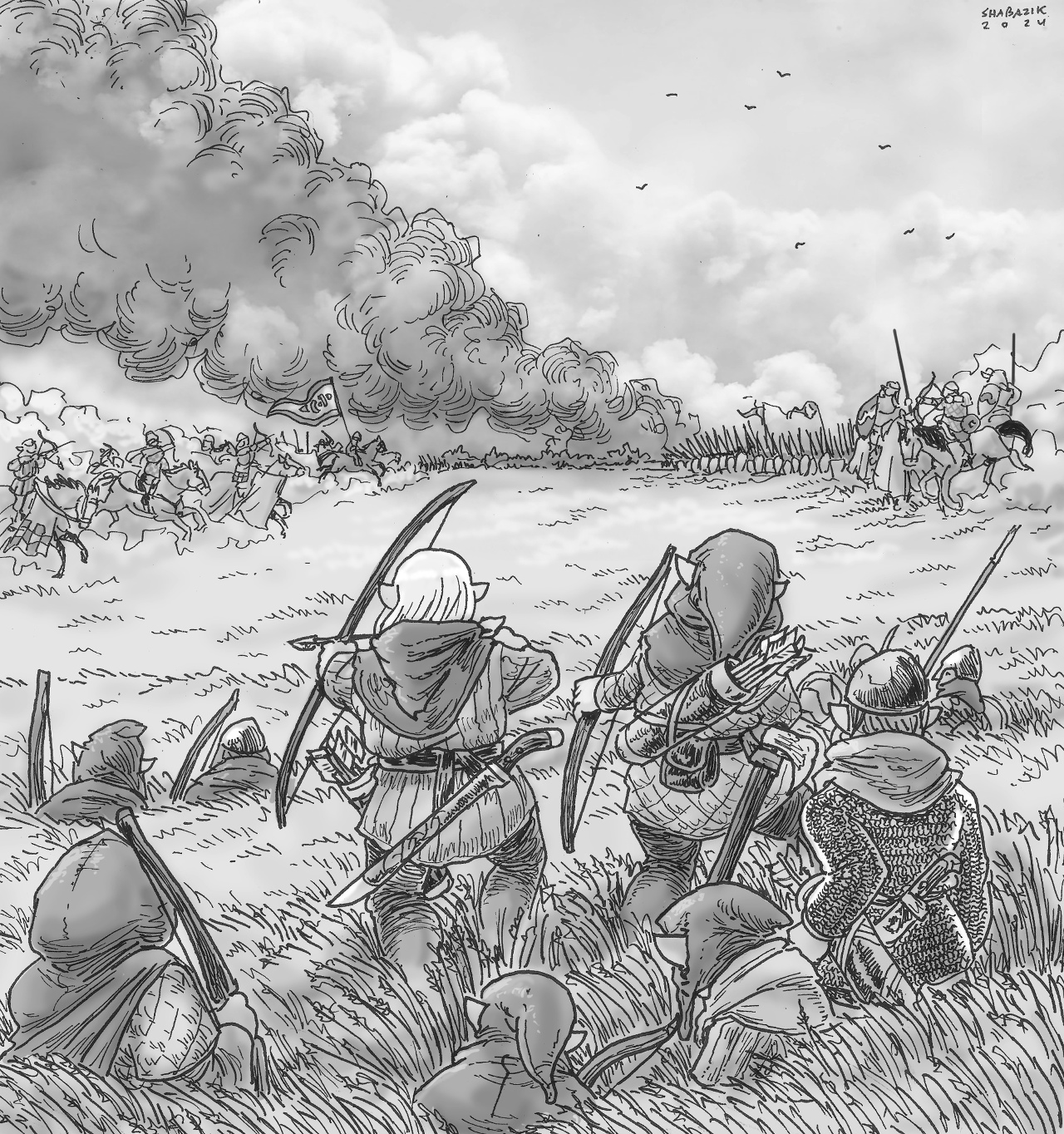 8. Война, конные лучники Баронства атакуют линию Герцогства. В высокой траве засада лучников и застрельщиков.